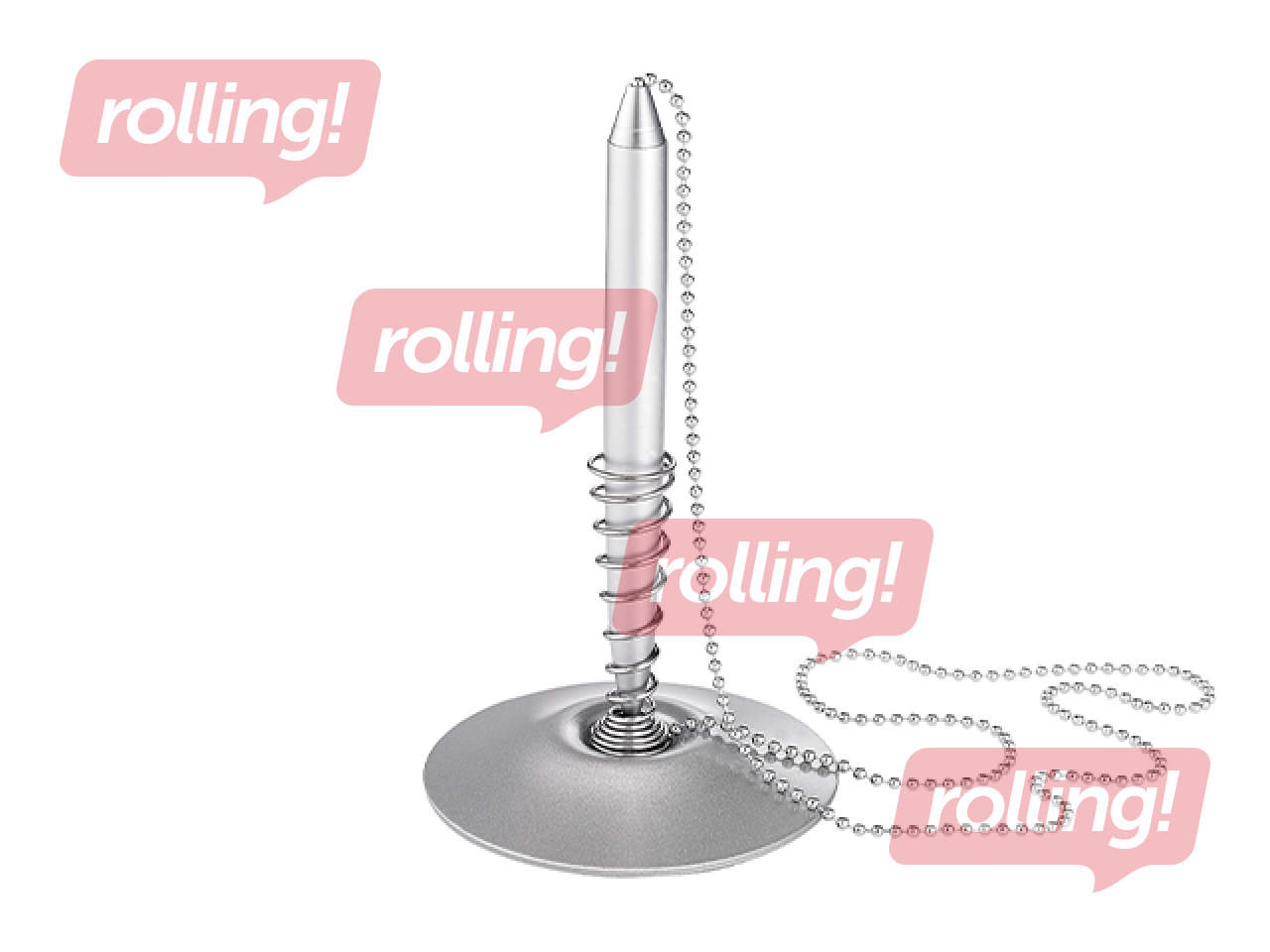 Lodīšu pildspalva uz apaļas metāla pamatnes ar stipru metāla lodīšu ķēdi (hromēta) un elastīgu spirālveida turētāju.