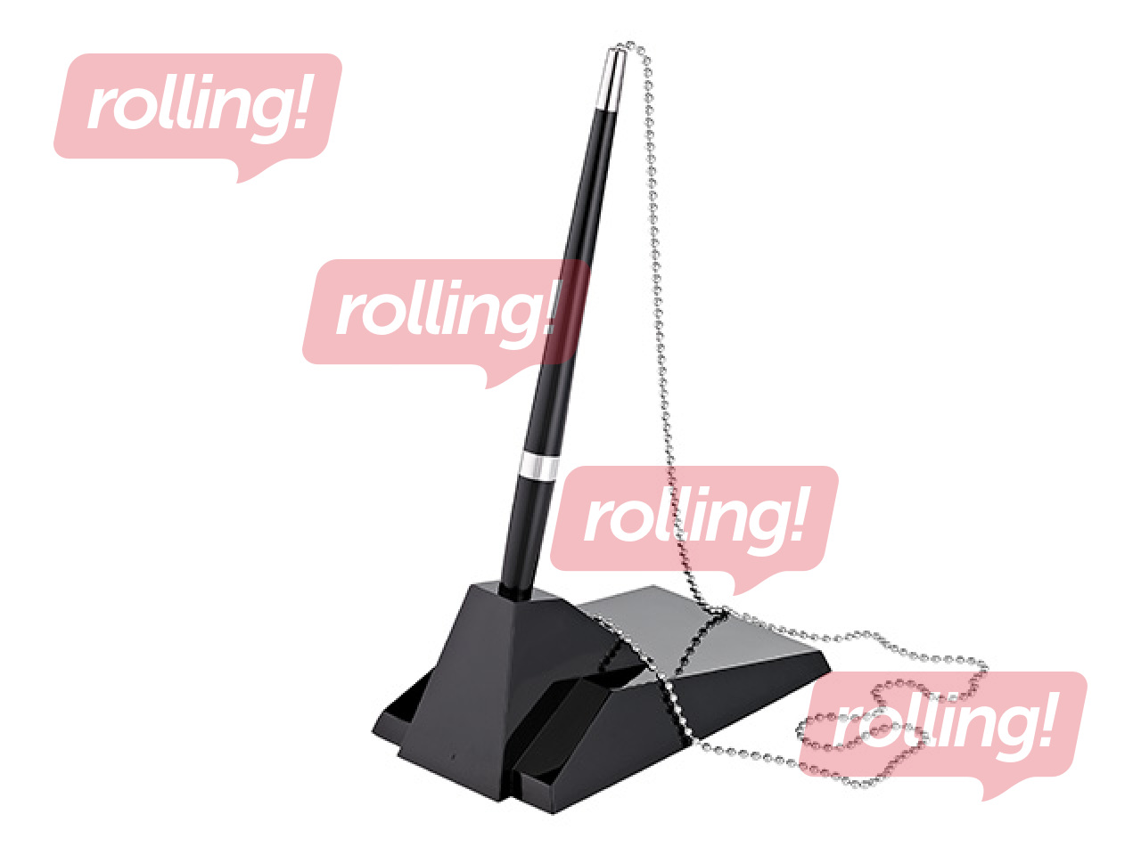 Plastmasas lodīšu pildspalva uz taisnstūrveida pamatnes ar stipru metāla lodīšu ķēdi (hromēta).