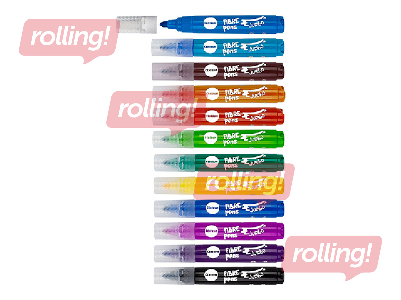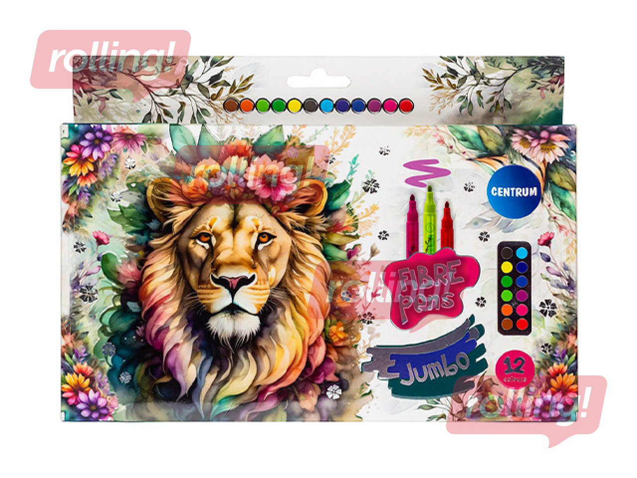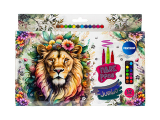 Krāsains Centrum JUMBO flomāsteru komplekts ar 12 spilgtām krāsām, kas paredzēts radošai zīmēšanai, krāsošanai un pašizpausmei gan skolā, gan mājās. Flomāsteru aptuvenais līnijas platums ir 3mm, nodrošinot biezāku un vienmērīgāku krāsas pārklājumu, kas padara tos īpaši piemērotus plašāku laukumu aizkrāsošanai un bērnu radošajiem darbiem.