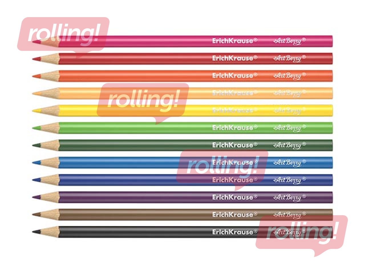 Ergonomiski trīsstūrveida krāsu zīmuļi ArtBerry®, kas izgatavoti no izvēlētā koka ar īpaši spilgtu svinu. Īpaša koka impregnēšana un cieta svina līmēšana nodrošina augstu triecienizturību. Mīkstais koks un perfekta svina izlīdzināšana garantē ērtu asināšanas iespēju ar ekonomisku zīmuļa patēriņu. 3 mm diametra zīmulis uzmanīgi velk, nesaskrāpē papīru un nesadrupina. Paciņā ietilpst 12 uzasināti krāsas zīmuļi, garums 175mm.