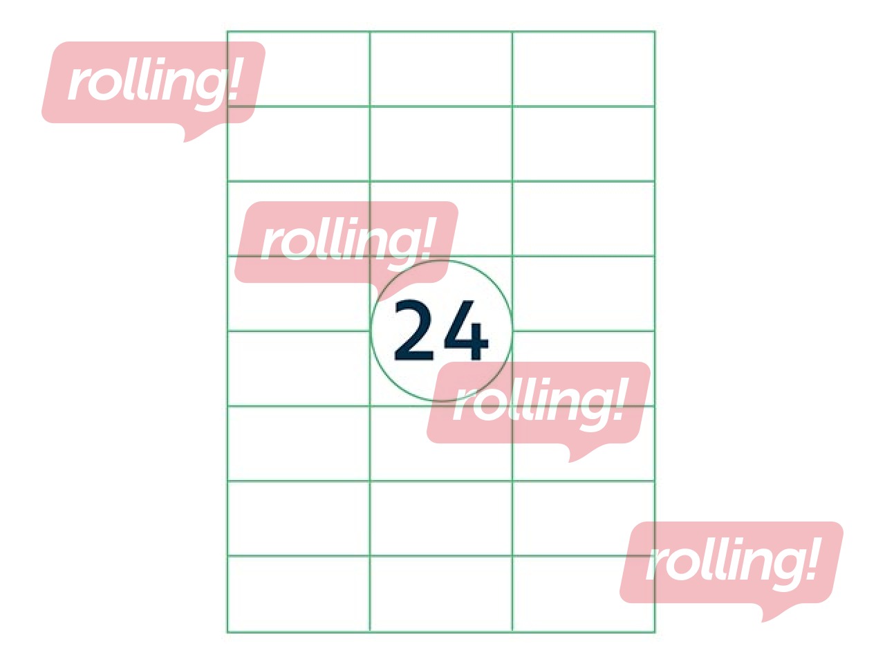 Pašlīmējošas baltas uzlīmes, piemērotas apdrukai ar tintes, lāzerprinteriem, kopēšanas tehnikai vai rakstīšanai ar roku. Uz A4 lapas 24 uzlīmes. Iepakojumā 100 lapas.