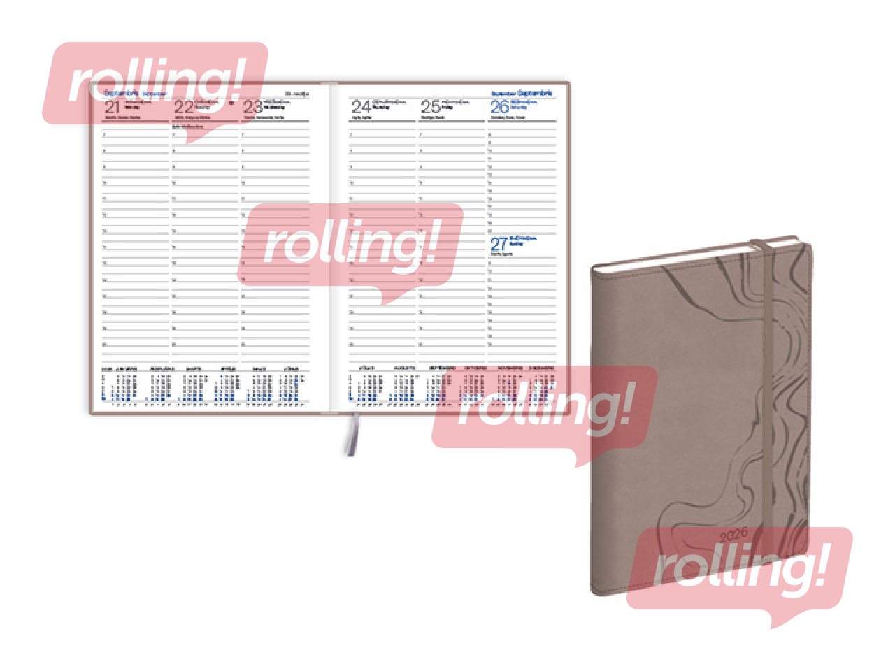 Kalendārs: viena nedēļa atvērumā. Izmērs: 142 mm x 205 mm. Apdare: FSC sertificēts papīrs, grāmatzīme, elastīgs mākslīgās ādas vāks ar apaļiem stūriem, ornaments reljefā, gumijas aizdare.