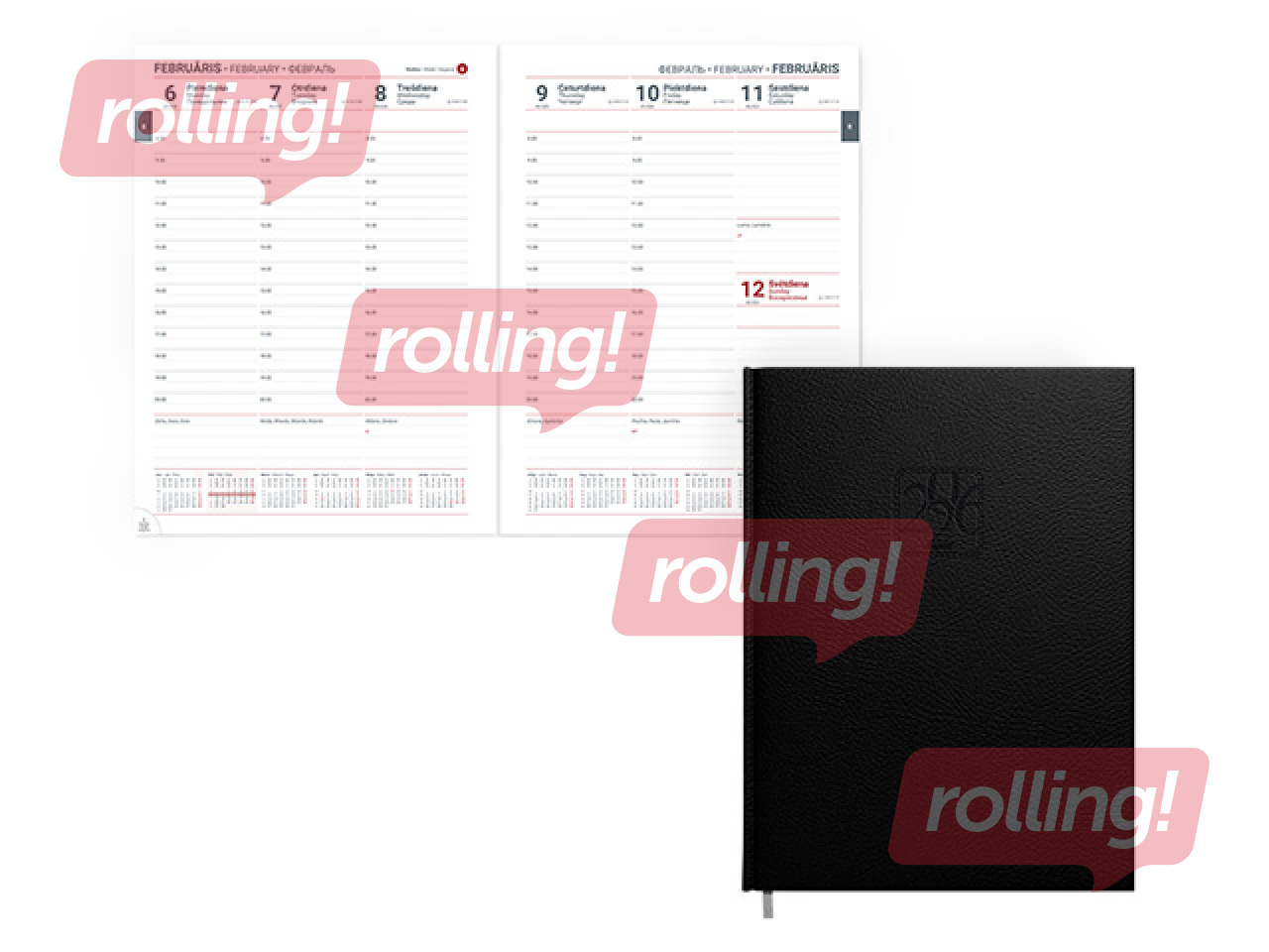 Polsterēti mākslīgās ādas vāki, grāmatzīme, cietais sējums, perforēti noplēšami lapu stūrīši.