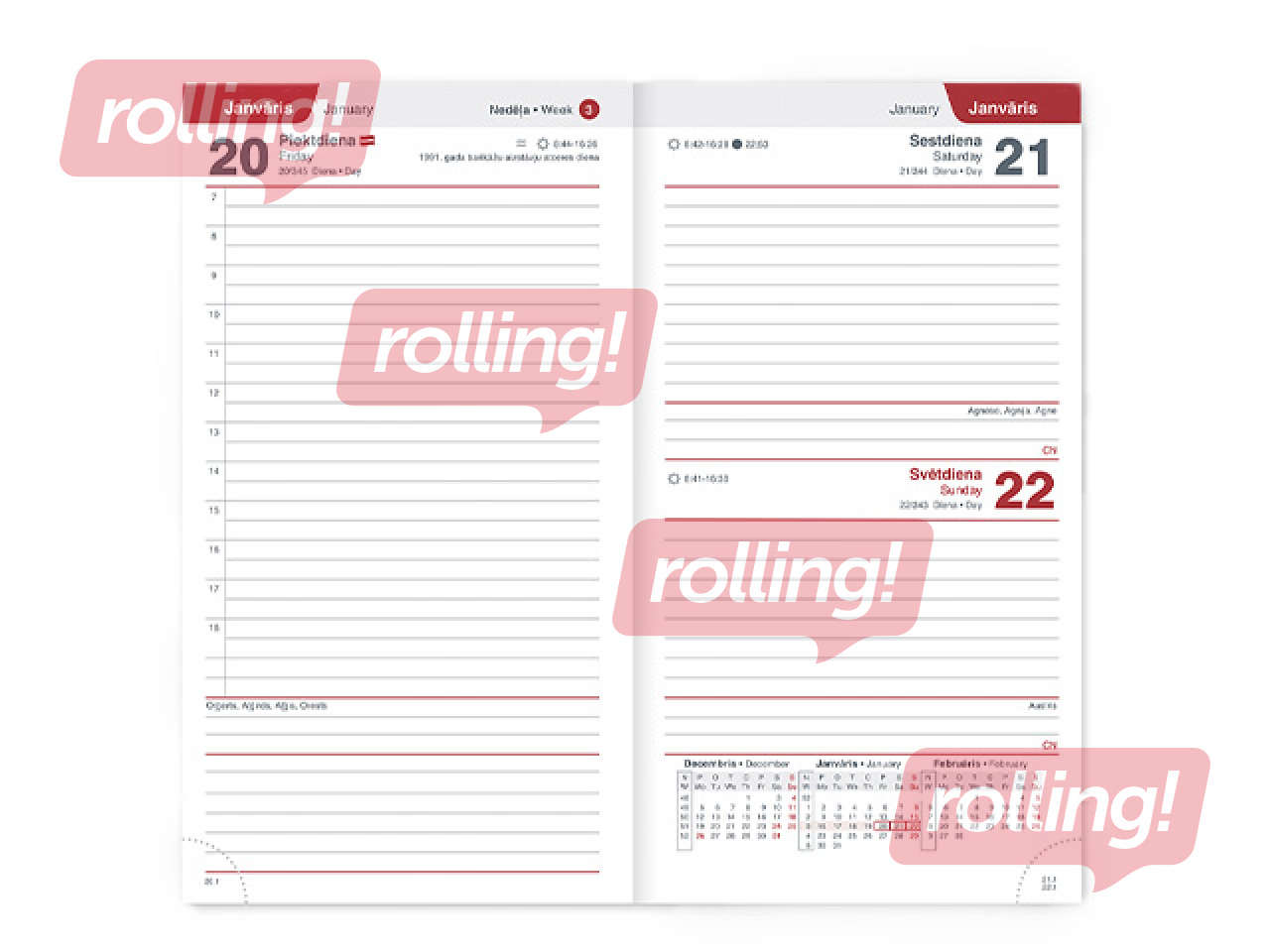 Apraksts: Plānotājos NEW LINE ir tabulas kalendārs, gada plāns, viena diena lappusē, nedēļu numerācija, valsts svētku un atzīmējamās dienas, karogu dienas, 38 citu valstu svētku dienas, norādīta pāreja uz vasaras un ziemas laiku, gadalaiku sākums, saullēkta un saulrieta laiki, mēness fāzes, zodiaka zīmju maiņas dienas, svarīgi telefona numuri, attāluu tabula, tālsarunu kodi, pasaules laiki, izmēru un mērvienību tabulas, kontaktu un piezīmju lapas.