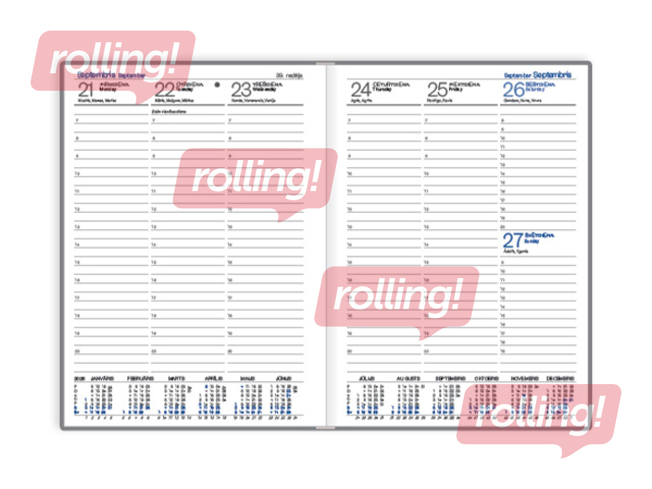 Dienasgrāmatas Prestige kalendārā daļa. Atvērumā viena nedēļa. Iesieta ar spirāli.