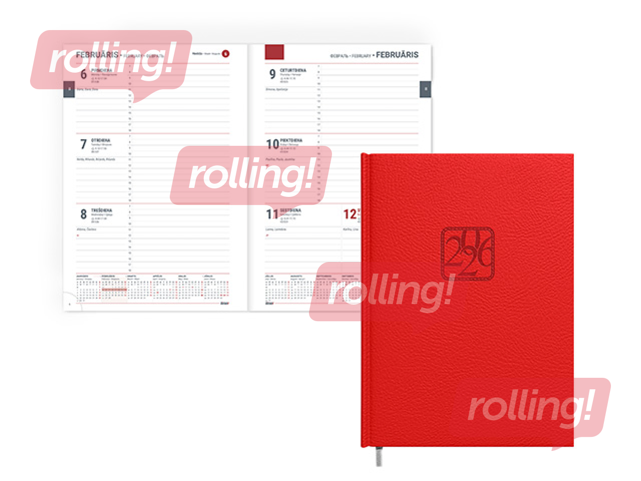 Kalendārs: viena nedēļa atvērumā, 2 valodas (latviešu, angļu).