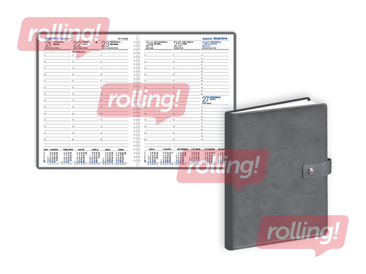 Apdare: FSC sertificēts papīrs, maināma kalendārā un adrešu daļa, iesiets ar spirāli, mākslīgās ādas vāks.
