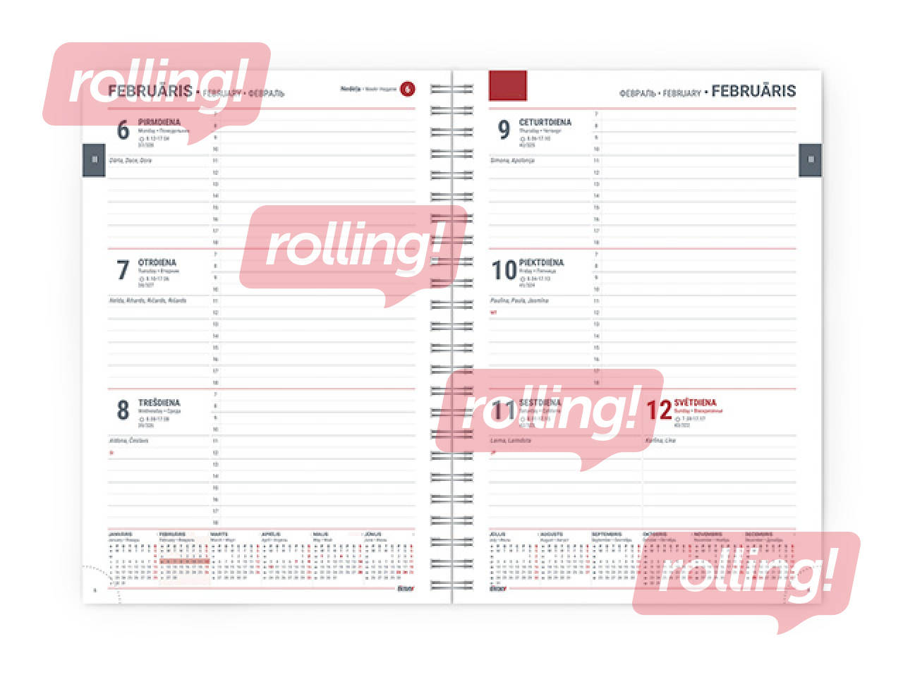 Kalendārs: viena nedēļa atvērumā, 2 valodas (latviešu, angļu).