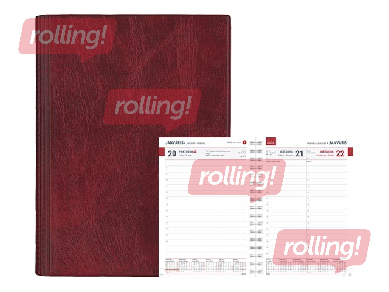 Apraksts: Visās A5 formāta dienasgrāmatās ir tabulas kalendārs, gada plāns, nedēļu numerācija, valsts svētku un atzīmējamās dienas, karogu dienas, vārda dienas, 38 citu valstu svētku dienas, norādīta pāreja uz vasaras un ziemas laiku, gadalaiku sākums, saullēkta un saulrieta laiki, mēness fāzes, zodiaka zīmju maiņas dienas, kontaktu un piezīmju lapas.