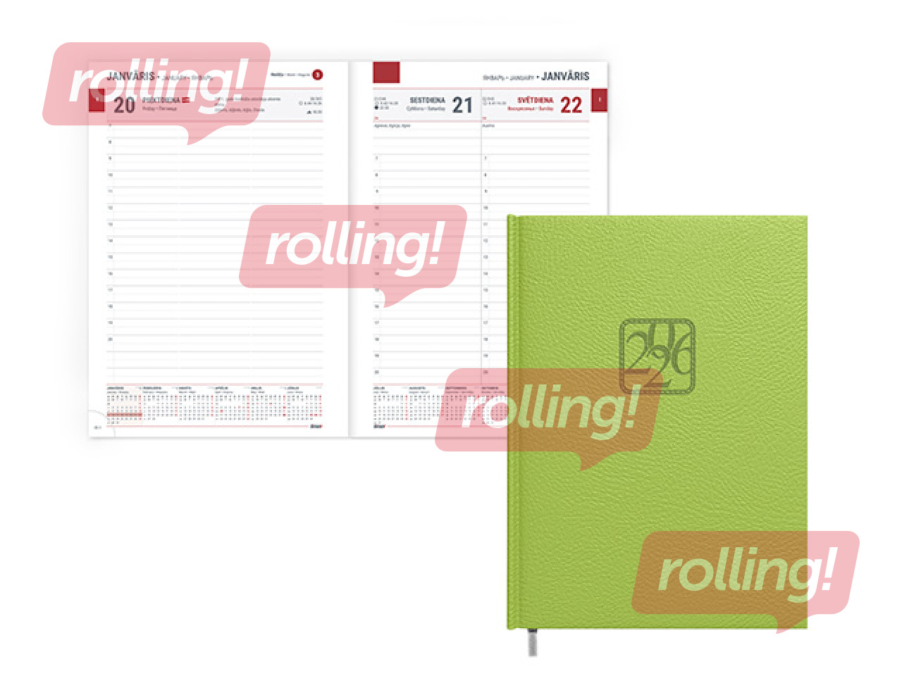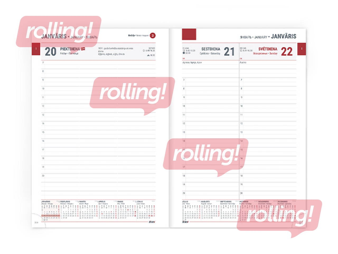 Visās A5 formāta dienasgrāmatās ir tabulas kalendārs, gada plāns, nedēļu numerācija, valsts svētku un atzīmējamās dienas, karogu dienas, vārda dienas, 38 citu valstu svētku dienas, norādīta pāreja uz vasaras un ziemas laiku, gadalaiku sākums, saullēkta un saulrieta laiki, mēness fāzes, zodiaka zīmju maiņas dienas, kontaktu un piezīmju lapas.