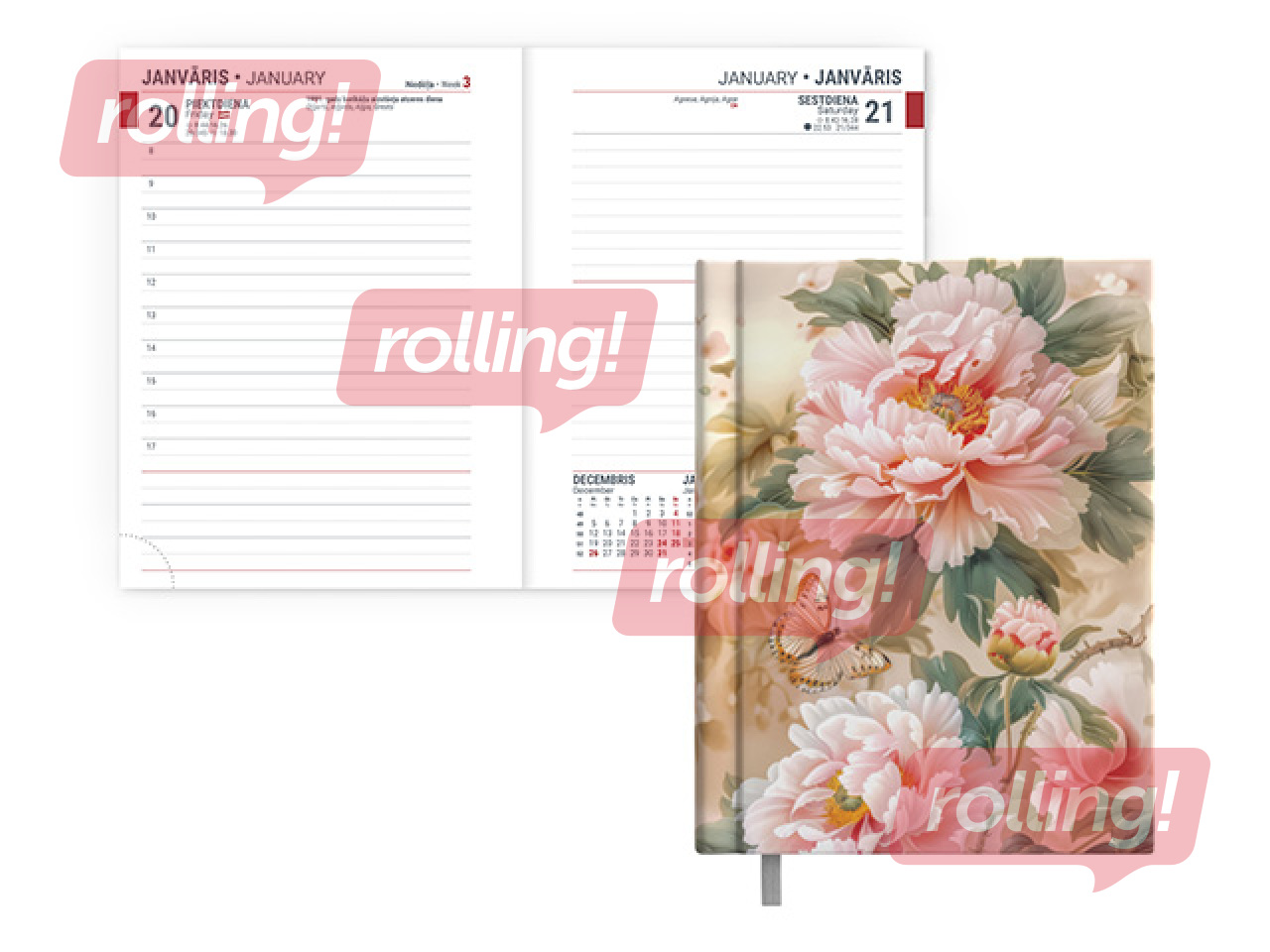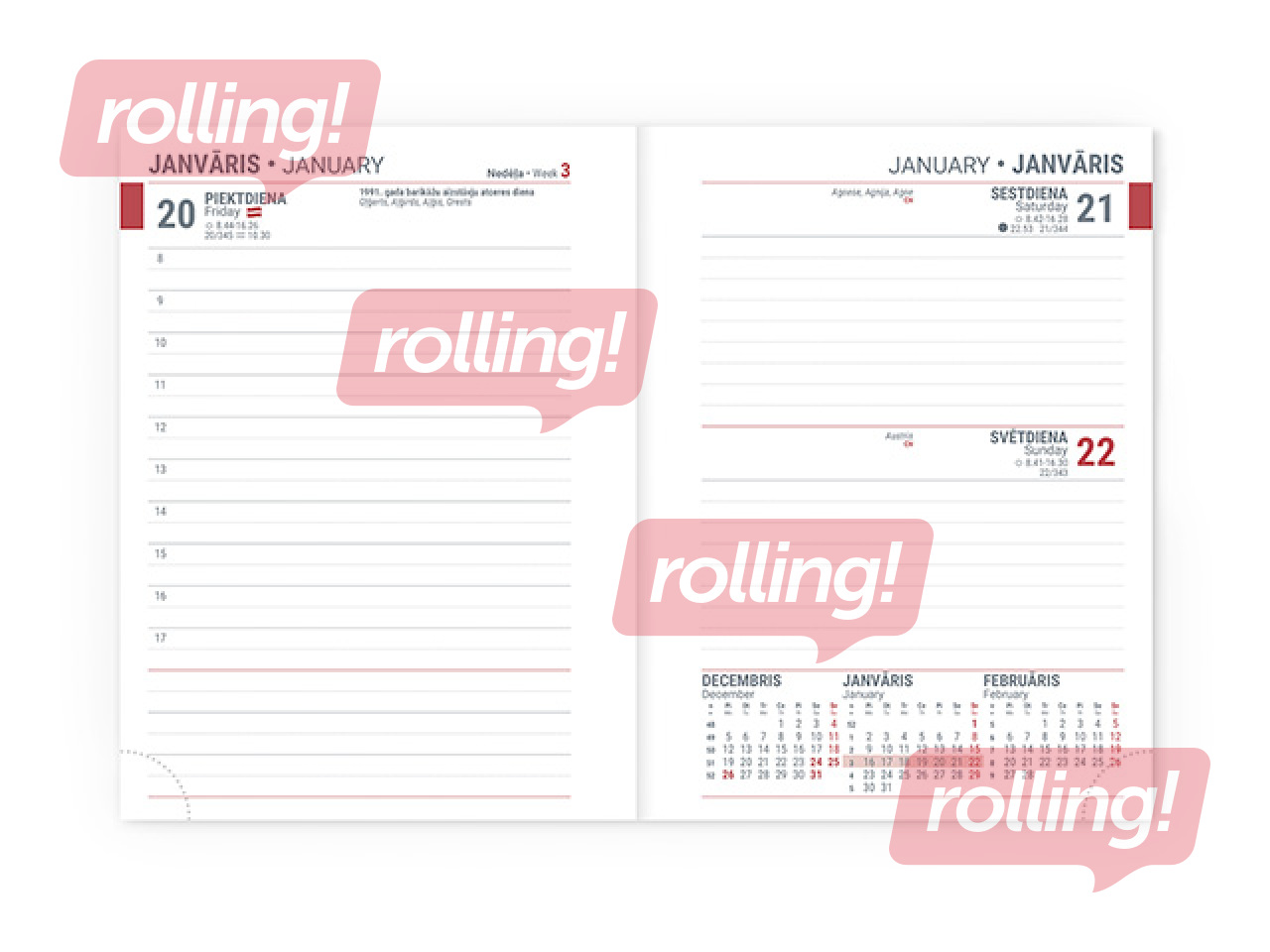 Papildinformācija: Polsterēti mākslīgās ādas un krāsaini dizaina vāki, grāmatzīme, cietais sējums, perforēti noplēšami lapu stūrīši.