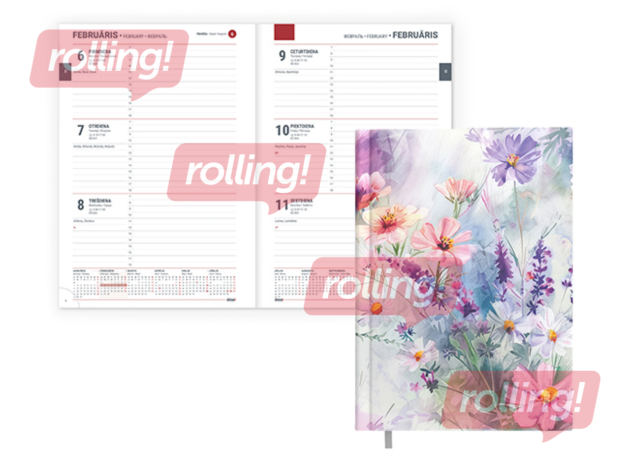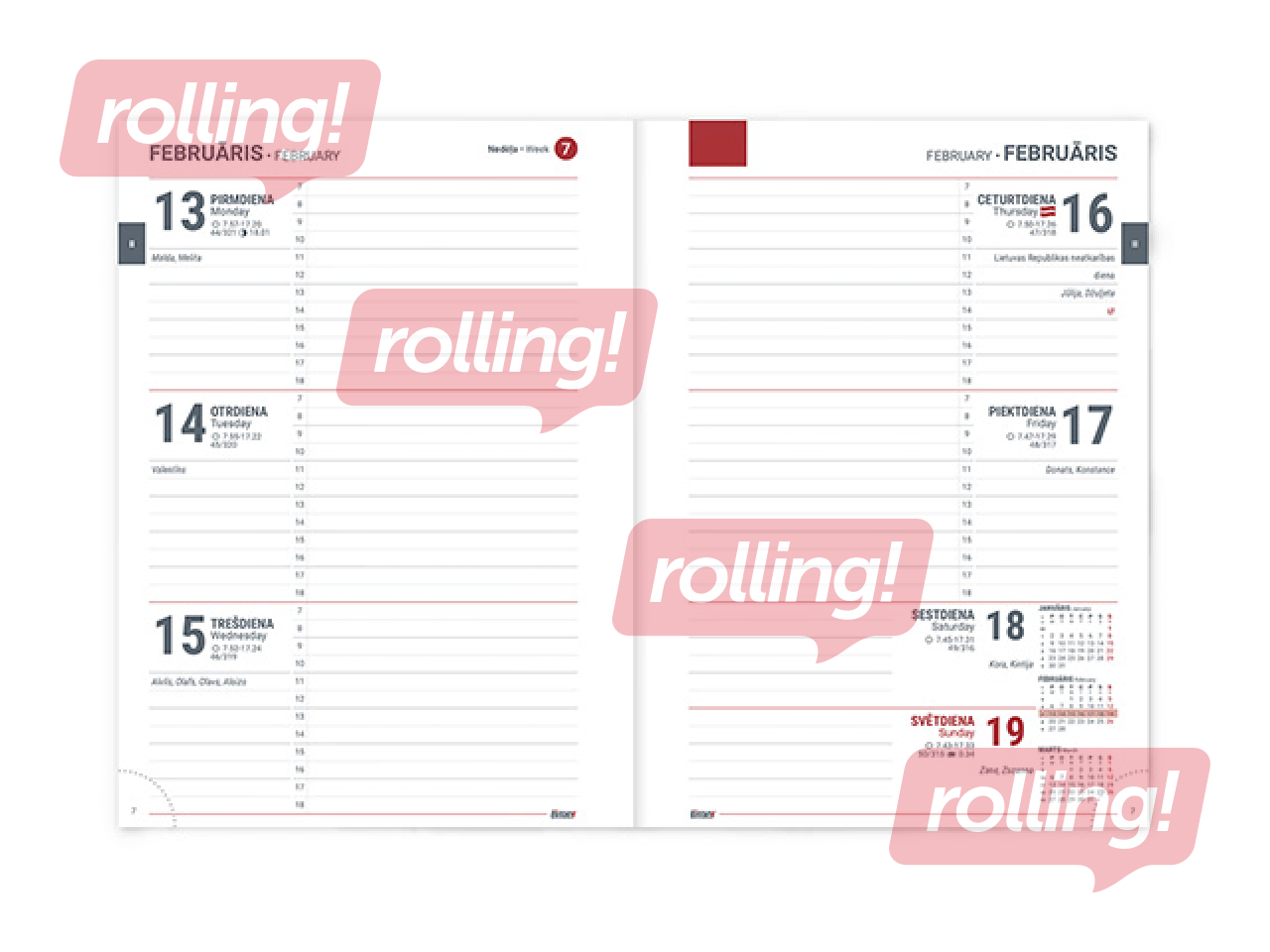 Kalendārs: viena nedēļa atvērumā, 2 valodas (latviešu, angļu).