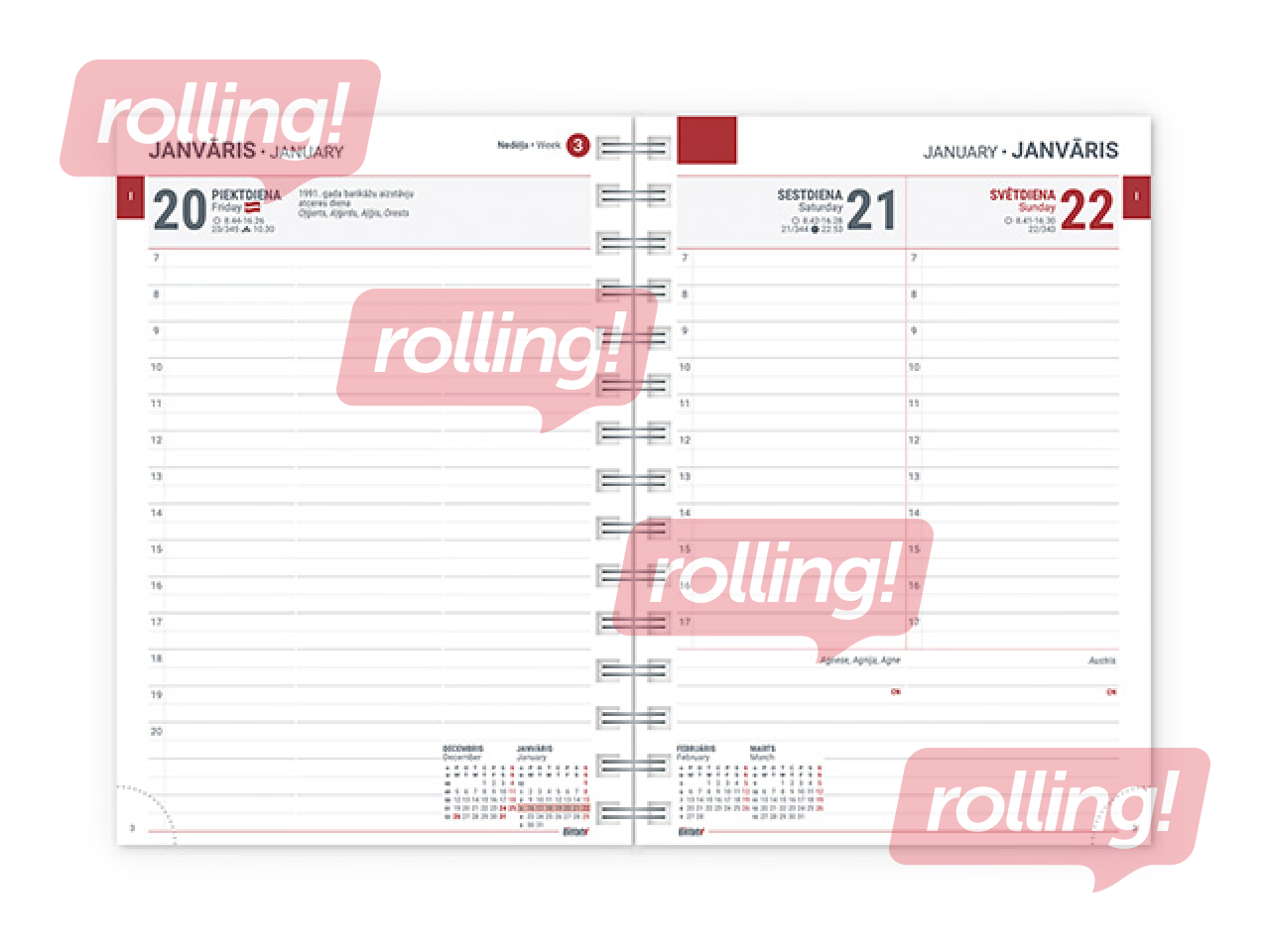 Apraksts: Visos plānotājos TEMPO DIENA ir tabulas kalendārs, gada plāns, viena diena lappusē, nedēļu numerācija, valsts svētku un atzīmējamās dienas, karogu dienas, vārda dienas, 38 citu valstu svētku dienas, norādīta pāreja uz vasaras un ziemas laiku, gadalaiku sākums, saullēkta un saulrieta laiki, mēness fāzes, zodiaka zīmju maiņas dienas, svarīgi telefona numuri, attālumu tabula, tālsarunu kodi, pasaules laiki, izmēru un mērvienību tabulas, kontaktu un piezīmju lapas.