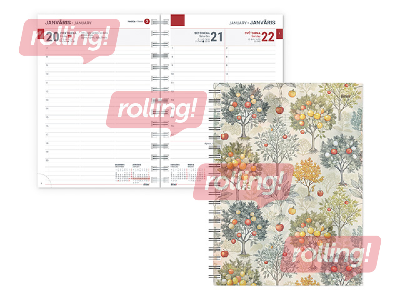 Apraksts: Visos plānotājos TEMPO DIENA ir tabulas kalendārs, gada plāns, viena diena lappusē, nedēļu numerācija, valsts svētku un atzīmējamās dienas, karogu dienas, vārda dienas, 38 citu valstu svētku dienas, norādīta pāreja uz vasaras un ziemas laiku, gadalaiku sākums, saullēkta un saulrieta laiki, mēness fāzes, zodiaka zīmju maiņas dienas, svarīgi telefona numuri, attālumu tabula, tālsarunu kodi, pasaules laiki, izmēru un mērvienību tabulas, kontaktu un piezīmju lapas.