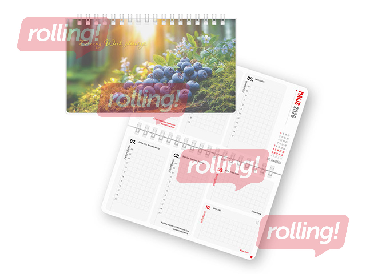 Maza formāta plānotājs nedēļas atvērumā ar esošā mēneša pārskatu, krāsainu priekšvāku zem puscaurspīdīga PP plastikāta vākiem. Plānošanas zonas rūtiņu noformējumā ar sadalījumu pa stundām. Iesieta ar metāla spirāli. Satur LR svētku, atceres un atzīmējamās dienas, vārda dienas, mēness fāzes u.c. lietderīgu informāciju. Ir paredzētas lapaspuses piezīmju ierakstīšanai, gada plāna sastādīšanai.