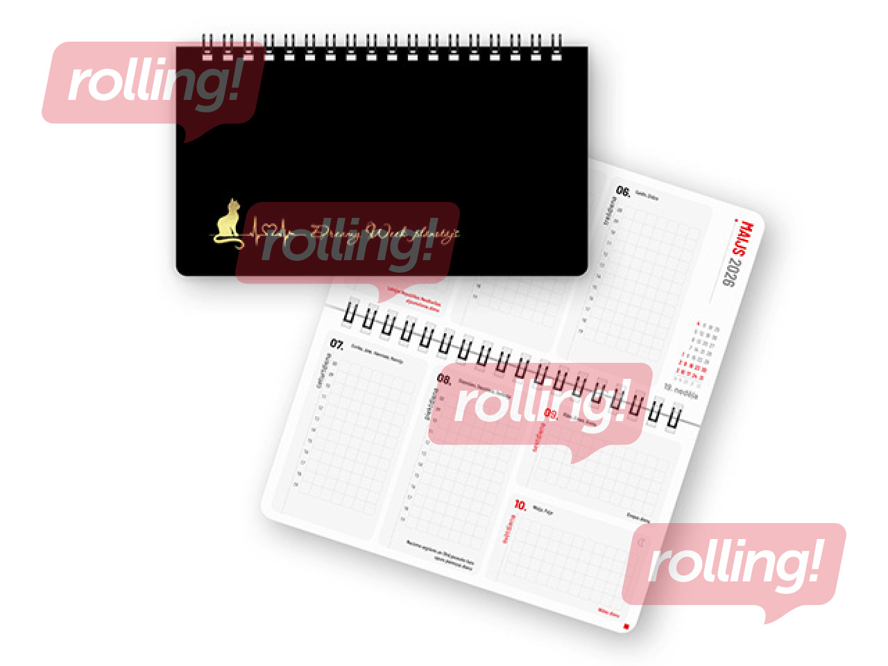 Maza formāta plānotājs nedēļas atvērumā ar esošā mēneša pārskatu, melniem vākiem no īpaši stingra kartona ar zelta folijas spiedi uz priekšvāka. Plānošanas zonas rūtiņu noformējumā ar sadalījumu pa stundām. Iesieta ar metāla spirāli. Satur LR svētku, atceres un atzīmējamās dienas, vārda dienas, mēness fāzes u.c. lietderīgu informāciju. Ir paredzētas lapaspuses piezīmju ierakstīšanai, gada plāna sastādīšanai.