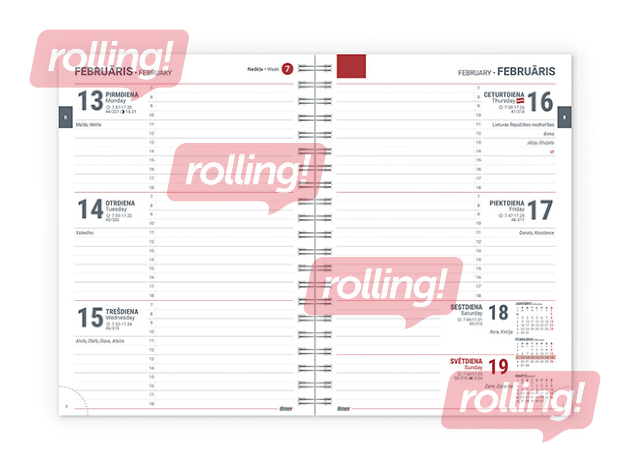 Apraksts: Visos plānotājos TEMPO DIENA ir tabulas kalendārs, gada plāns, viena diena lappusē, nedēļu numerācija, valsts svētku un atzīmējamās dienas, karogu dienas, vārda dienas, 38 citu valstu svētku dienas, norādīta pāreja uz vasaras un ziemas laiku, gadalaiku sākums, saullēkta un saulrieta laiki, mēness fāzes, zodiaka zīmju maiņas dienas, svarīgi telefona numuri, attālumu tabula, tālsarunu kodi, pasaules laiki, izmēru un mērvienību tabulas, kontaktu un piezīmju lapas.