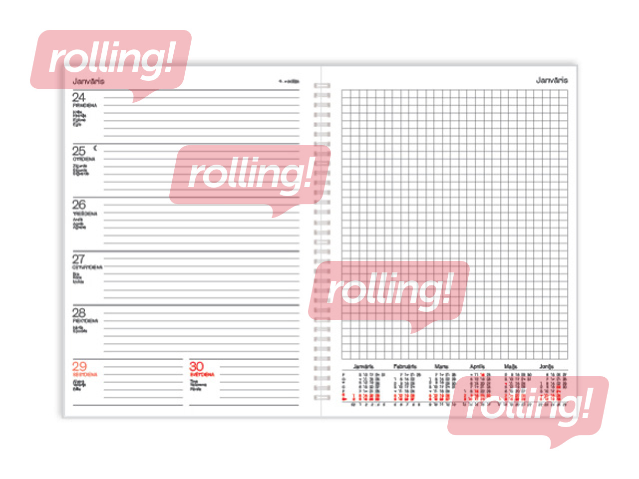 Viena nedēļa atvērumā + vieta piezīmēm, FSC sertificēts papīrs. Izmērs: 142x205mm.