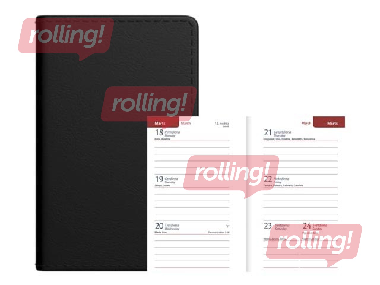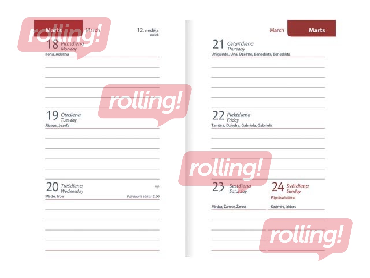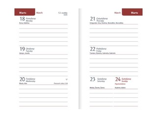 Apraksts: Visos plānotājos MINI A8 ir tabulas kalendārs, gada plāns, viena nedēļa atvērumā, nedēļu numerācija, valsts svētku un atzīmējamās dienas, karogu dienas, vārda dienas, norādīts gadalaiku sākums, saullēkta un saulrieta laiki, mēness fāzes, zodiaka zīmju maiņas dienas, svarīgi telefona numuri, attālumu tabula, kontaktu un piezīmju lapas.