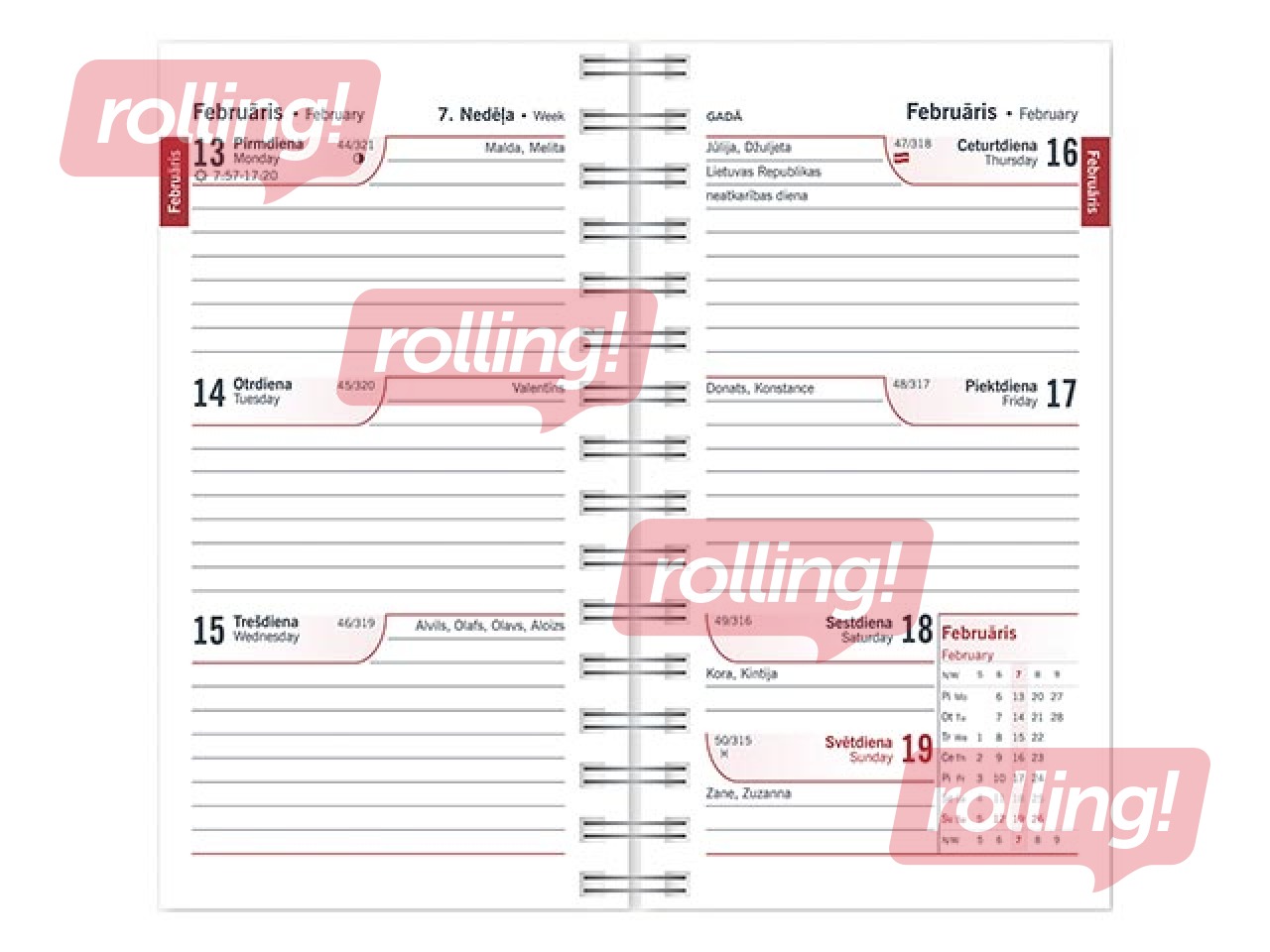 Visos plānotājos MINI ir tabulas kalendārs, gada plāns, viena nedēļa atvērumā, nedēļu numerācija, valsts svētku un
