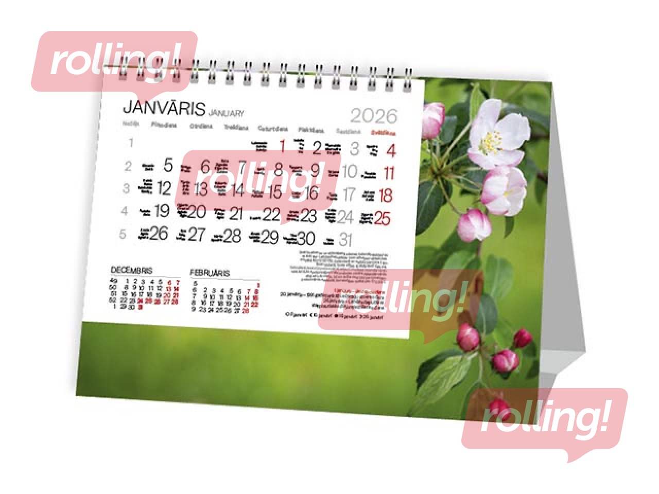 Kalendārs: trīs mēneši lapā (iepriekšējais, kārtējais un nākamais). Izmērs: 205 mm x 150 mm (pamatne).