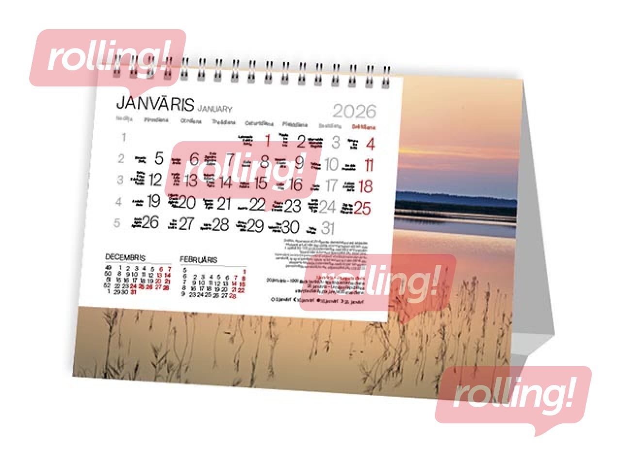Kalendārs: trīs mēneši lapā (iepriekšējais, kārtējais un nākamais). Izmērs: 205 mm x 150 mm (pamatne).
