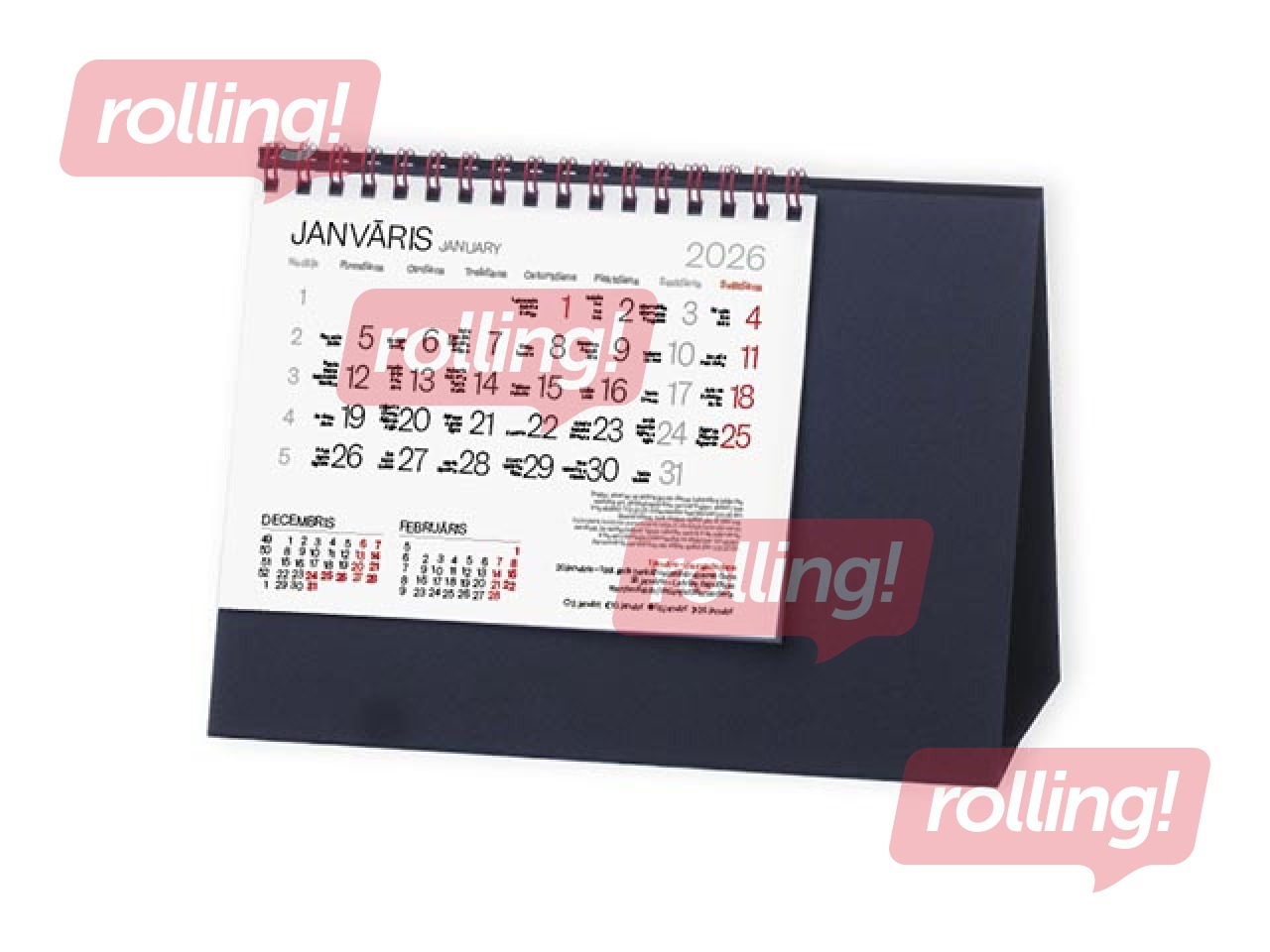 12 lapas un bieza, melna kartona piramīdveida pamatne. Trīs mēneši lapā (iepriekšējais, kārtējais un nākamais), iesiets ar spirāli. Uz melnas kartona pamatnes iespējams zelta, sudraba vai citas krāsas logotipa uzspiedums. ir pieejamas ar sarkanu vai zelta krāsas spirāli.