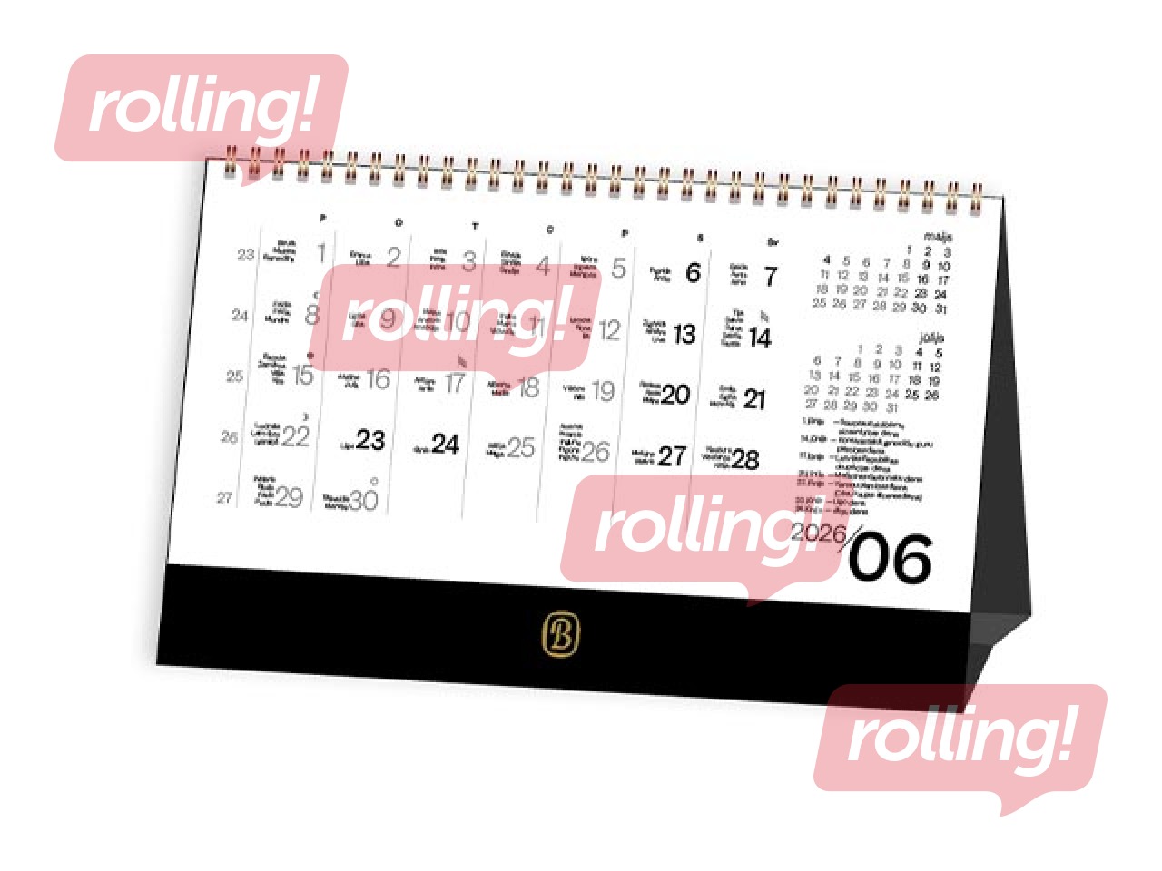 Kalendārs: 12 lapas un bieza melna kartona piramīdveida pamatne, trīs mēneši lapā (iepriekšējais, kārtējais un nākamais), iesiets ar spirāli.