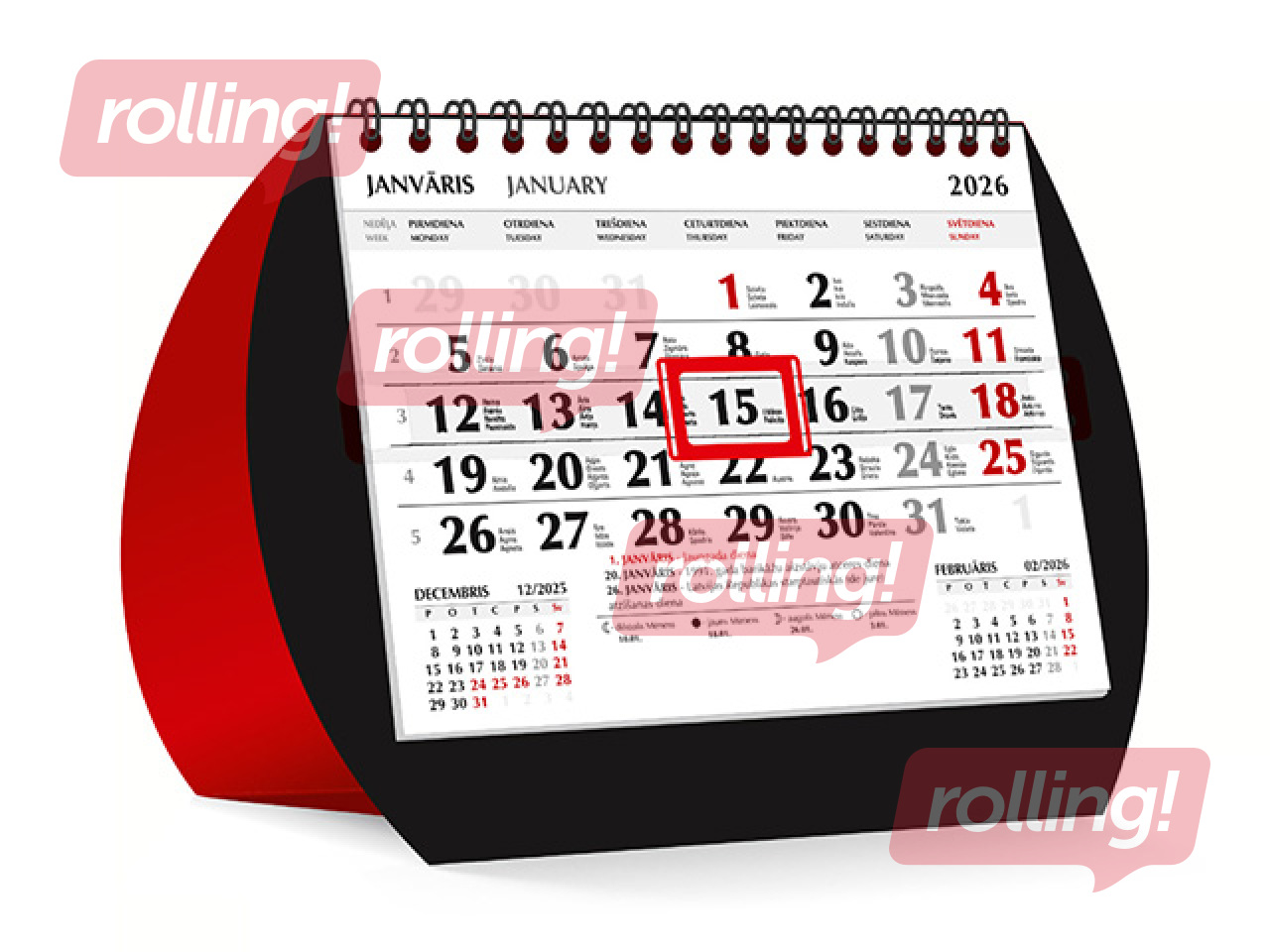 ar melnu metāla spirāli. Satur vārda dienas, mēness fāzes, Latvijas svētku, atceres un atzīmējamās dienas. Ar lodziņu datuma apzīmēšanai, PP iepakojumā.