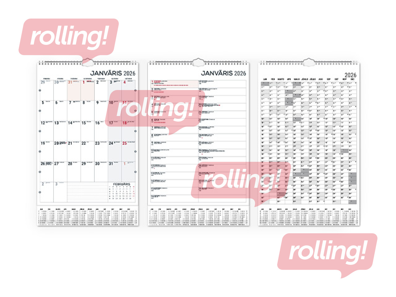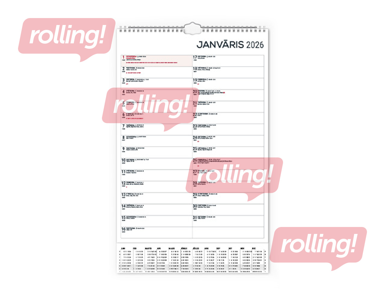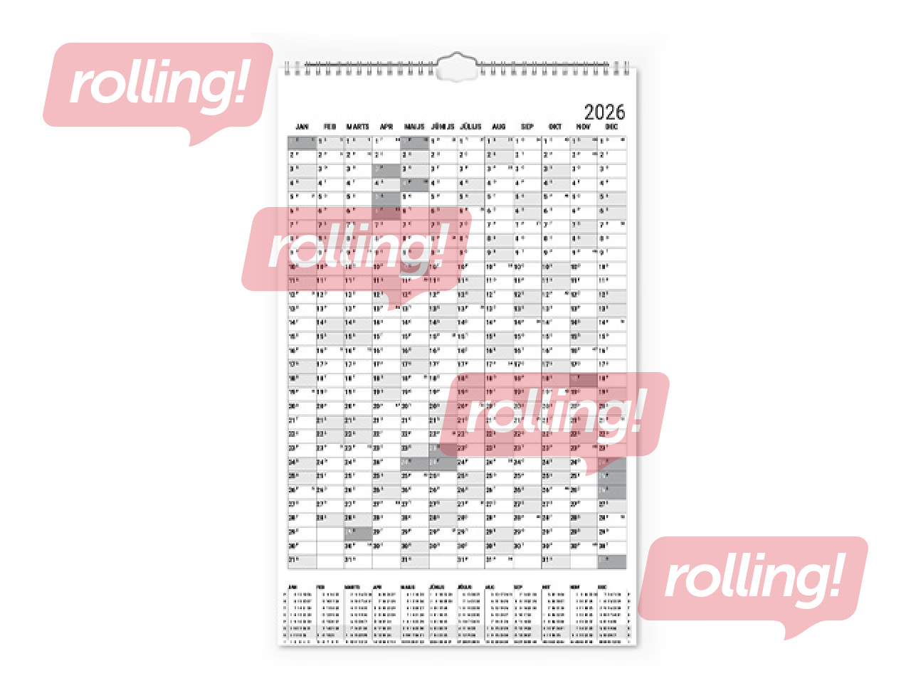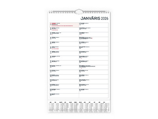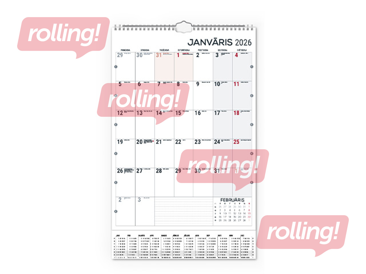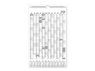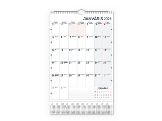 Ar spirāli, cilpa pakarināšanai pie sienas, gada plāns uz kartona pamatnes, divpusējs, iekļauts statiskais datuma marķieris, saturs tumši pelēks/sarkans.