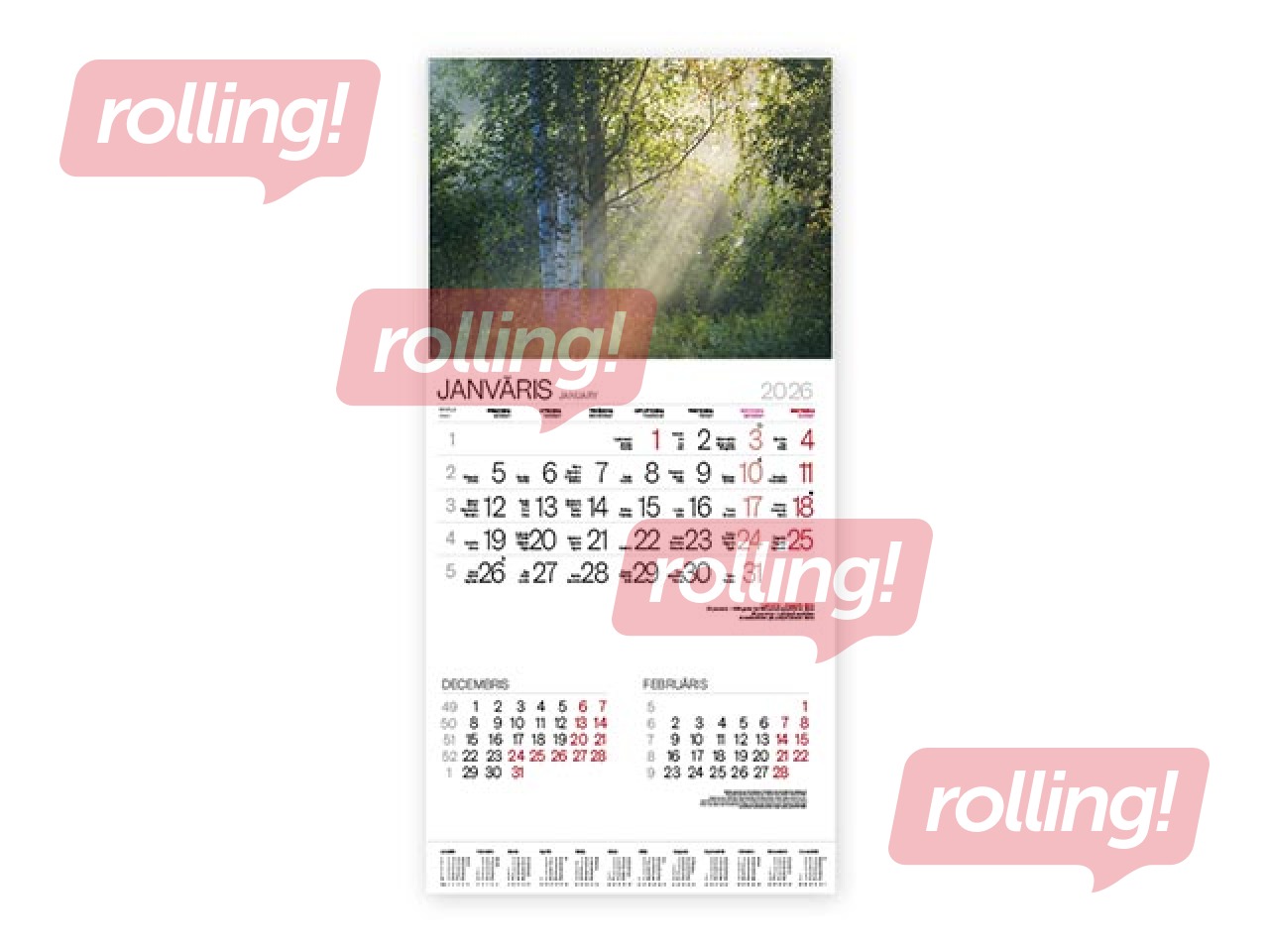 Kalendārs: trīs mēneši lapā (iepriekšējais, kārtējais un nākamais). Izmērs: 305 mm x 630 mm (ar augšdaļu)