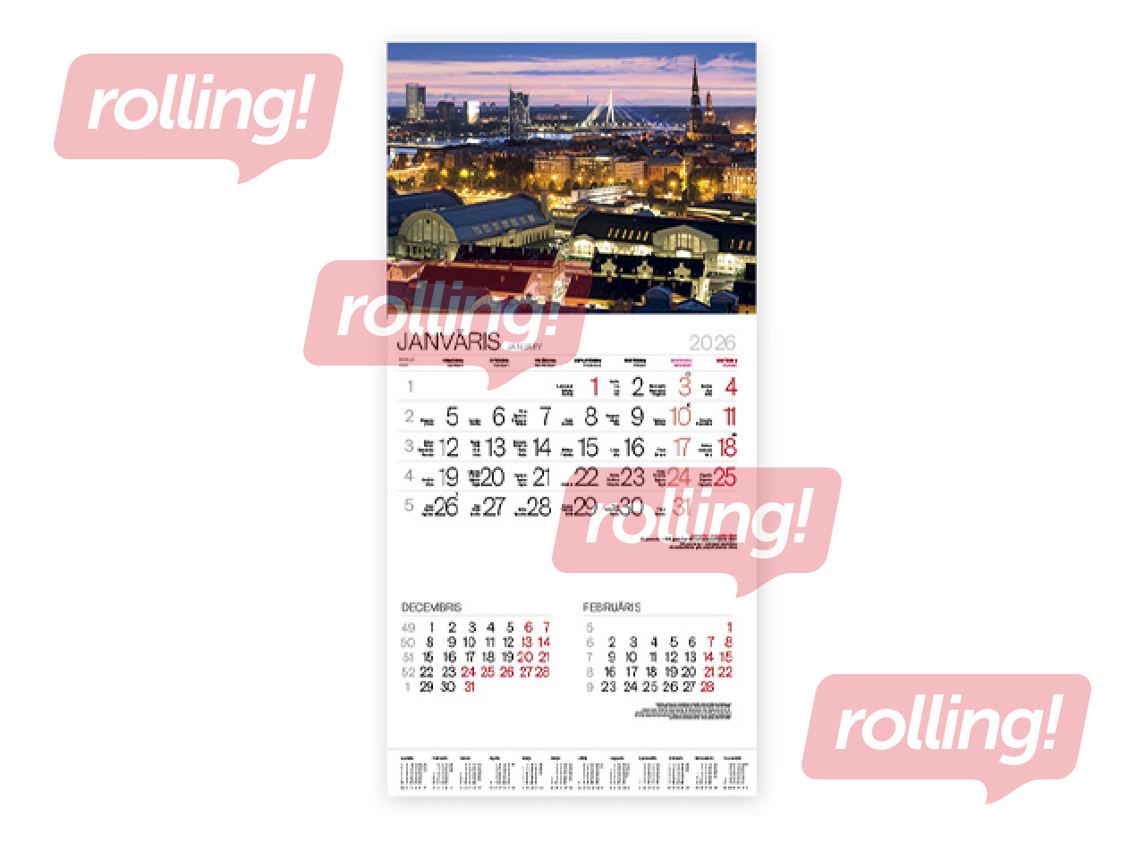 Izmērs: 305 mm x 630 mm (ar augšdaļu). Apjoms: 12 lapas un kartona pamatne ar gada pārskatu. Apdare: krāsaina kartona augšdaļa, pārbīdāms datuma rādītājs. Iesējums: ar skavu.