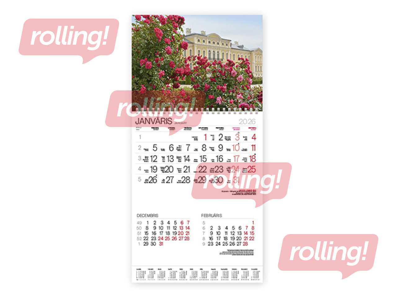 Kalendārs: divdaļīgs trīs mēnešu pārskats (iepriekšējais, kārtējais un nākamais), trīs valodas (latviešu,angļu, krievu). Izmērs: 305 mm x 630 mm (ar augšdaļu). Apjoms: 2 x 12 lapas un divas kartona pamatnes. Apdare: krāsaina kartona augšdaļa, pārbīdāms datuma rādītājs. Iesējums: ar spirāli.