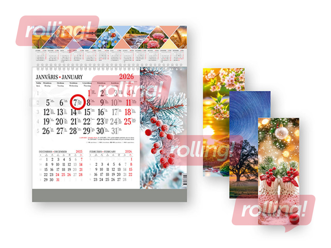 SIENAS KALENDĀRS, ar unikālu attēlu katram gada mēnesim. Ar kartona pamatni un gada pārskatu. Sastiprināts ar 1 metāla spirāli, ar lodziņu datuma apzīmēšanai. Satur vārda dienas, mēness fāzes, Latvijas svētku, atceres un atzīmējamās dienas. PP iepakojumā..