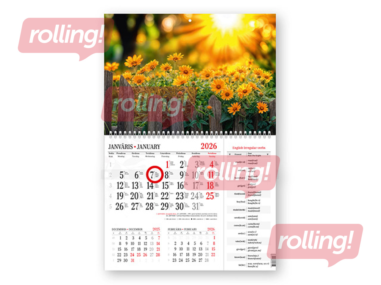 SIENAS KALENDĀRS, ar krāsainu augšdaļu un 160 Irregular English Verbs sarakstu, ar kartona pamatni. Sastiprināts ar 1 metāla spirāli, ar lodziņu datuma apzīmēšanai. Satur vārda dienas, mēness fāzes, Latvijas svētku, atceres un atzīmējamās dienas. PP iepakojumā.