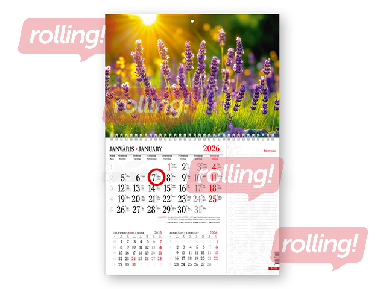 SIENAS KALENDĀRS, ar krāsainu augšdaļu, piezīmju lapu bloku 12 mēnešiem un kartona pamatni. Sastiprināts ar 1 metāla spirāli, ar lodziņu datuma apzīmēšanai. Satur vārda dienas, mēness fāzes, Latvijas svētku, atceres un atzīmējamās dienas. PP iepakojumā.