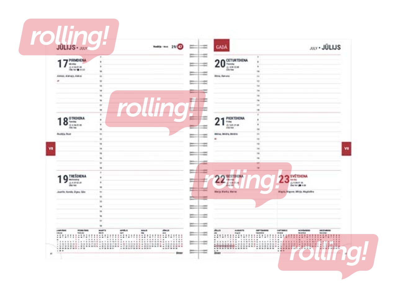 Papildinformācija: Mākslīgās ādas vāki ar nošūtu malu, ar datumiem, ar spirāli, Latvijas karte, perforēti noplēšami lapu stūrīši, 14 mēneši