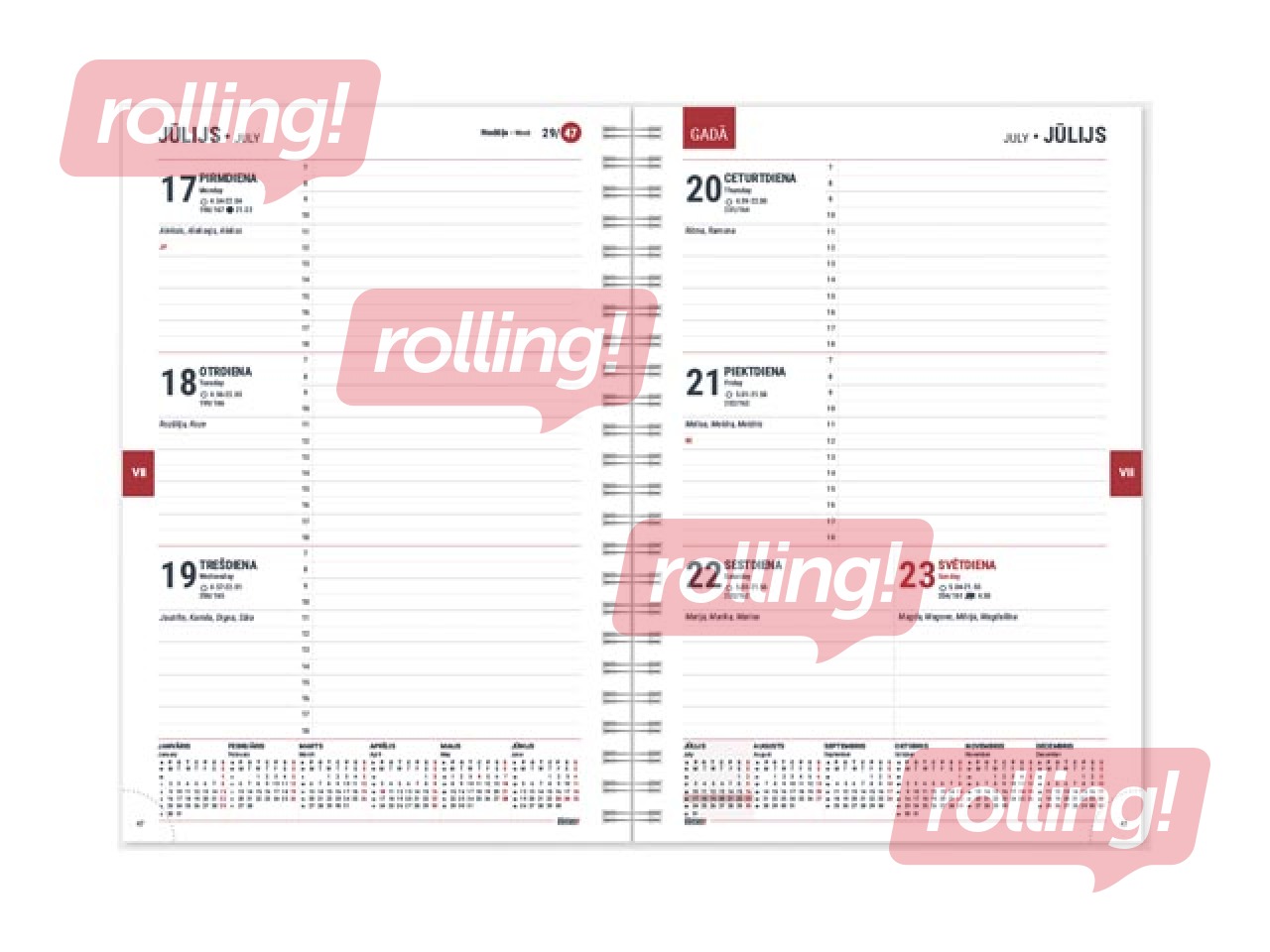 Mākslīgās ādas vāki ar nošūtu malu, moderni krāsu un materiālu salikumi, reljefa iespiedums uz vāka, ar datumiem, ar spirāli, Latvijas karte, perforēti noplēšami lapu stūrīši, 14 mēneši