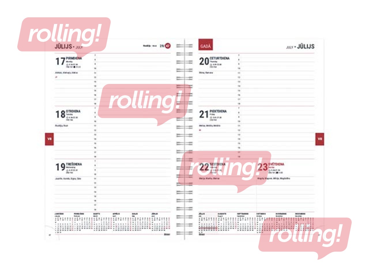 Papildinformācija: Mākslīgās ādas vāki ar nošūtu malu un gumijas aizdari, ar spirāli, ar datumiem, Latvijas karte, perforēti noplēšami lapu stūrīši, 14 mēneši