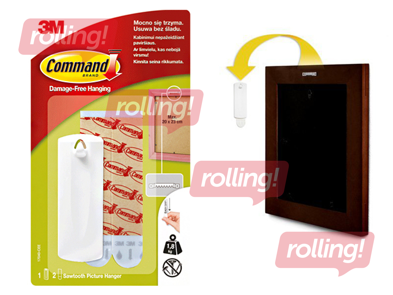 Command āķis uzkarināmiem rāmjiem piemērots līdz 1.8 kg smagu gleznu vai fotorāmju uzkarināšanai . Pie sienas pielīmējams ar līmvielas loksni, kas noņemama nebojājot virsmu. Pārlīmējams citur ar jaunu līmvielas loksni.