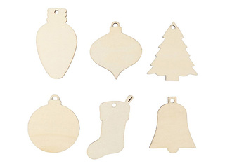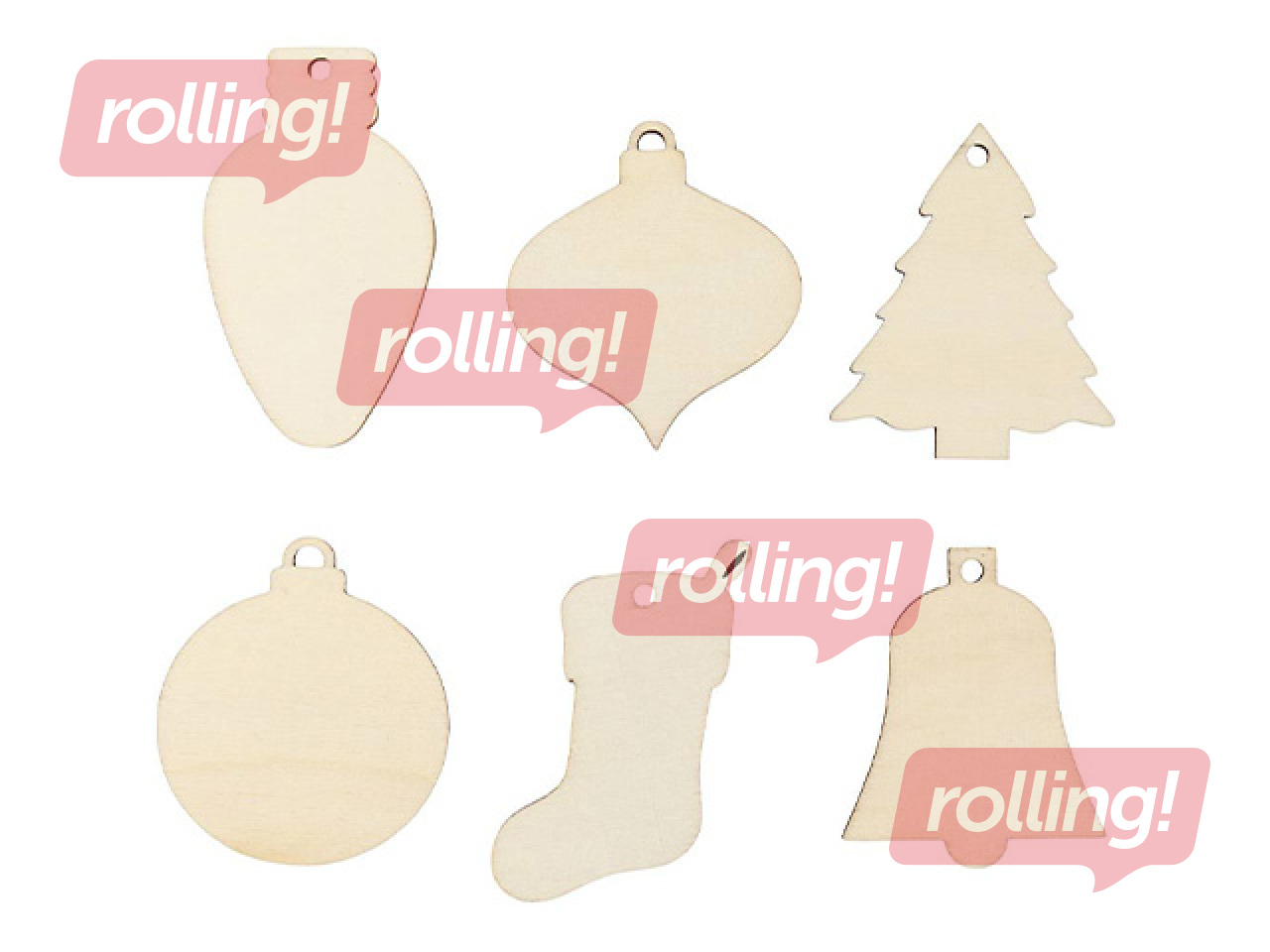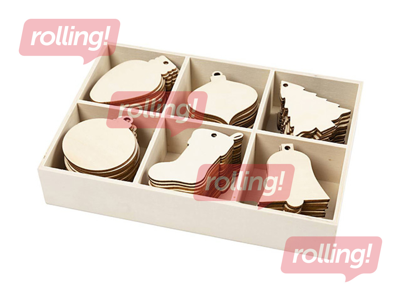 Katra figūriņa veidota kā klasisks Ziemassvētku simbols: svētku eglīte, pīta sirsniņa, zeķīte, zvaniņš un trīs dažādu formu Ziemassvētku bumbas. Dabīgais koks piešķir rotājumiem siltu, dabisku noskaņu, taču tos var viegli personalizēt, lai tie atbilstu jūsu gaumei. Katrā figūriņā ir mazs caurums, kas ļauj to ērti iekārt ar lentīti vai aukliņu.