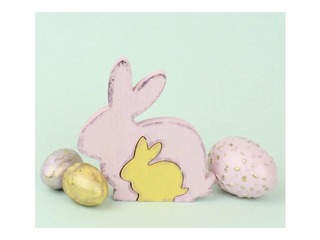 Divas figūriņas vienā, izgatavotas no gaiša koka. Mazāko zaķi var izņemt no lielākā.