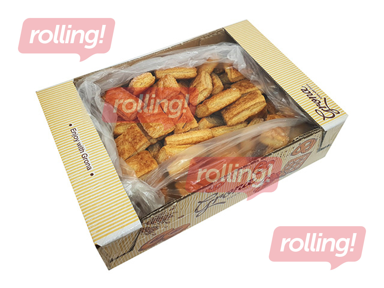 Sastāvdaļas: augstākā labuma kviešu milti, margarīns (rafinēta, dezodorēta palmu eļļa un tās frakcijas, ūdens, emulgatori (taukskābju mono- un diglicerīdi, poliglicerīna ēteri un taukskābes, sojas lecitīns), pārtikas sāls, skābuma regulētājs citronskābe, aromatizētājs “Sviests”, krāsviela karotīns), pūdercukurs, sviests (pasterizēts piena krējums, eļļa), pārtikas sāls, proteāzes enzīms.