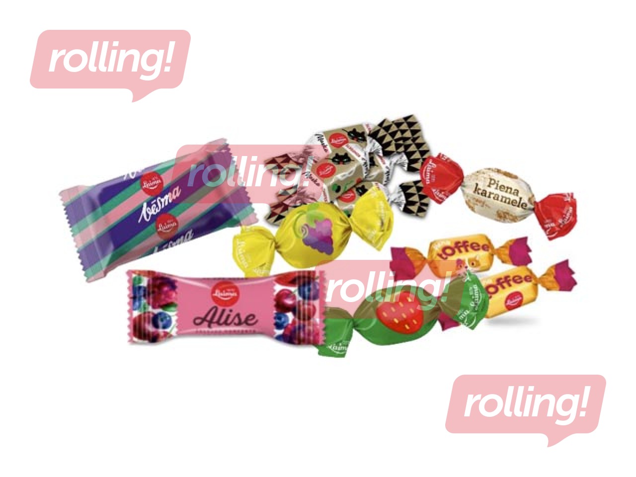 Saldumu izlase: Vēsma 8gb, Alise 8gb, Piena toffe īrisa konf . 7gb, Maska 7gb, Piena karameles 6gb. Zemeņu 6gb, Vīnogu 5gb.