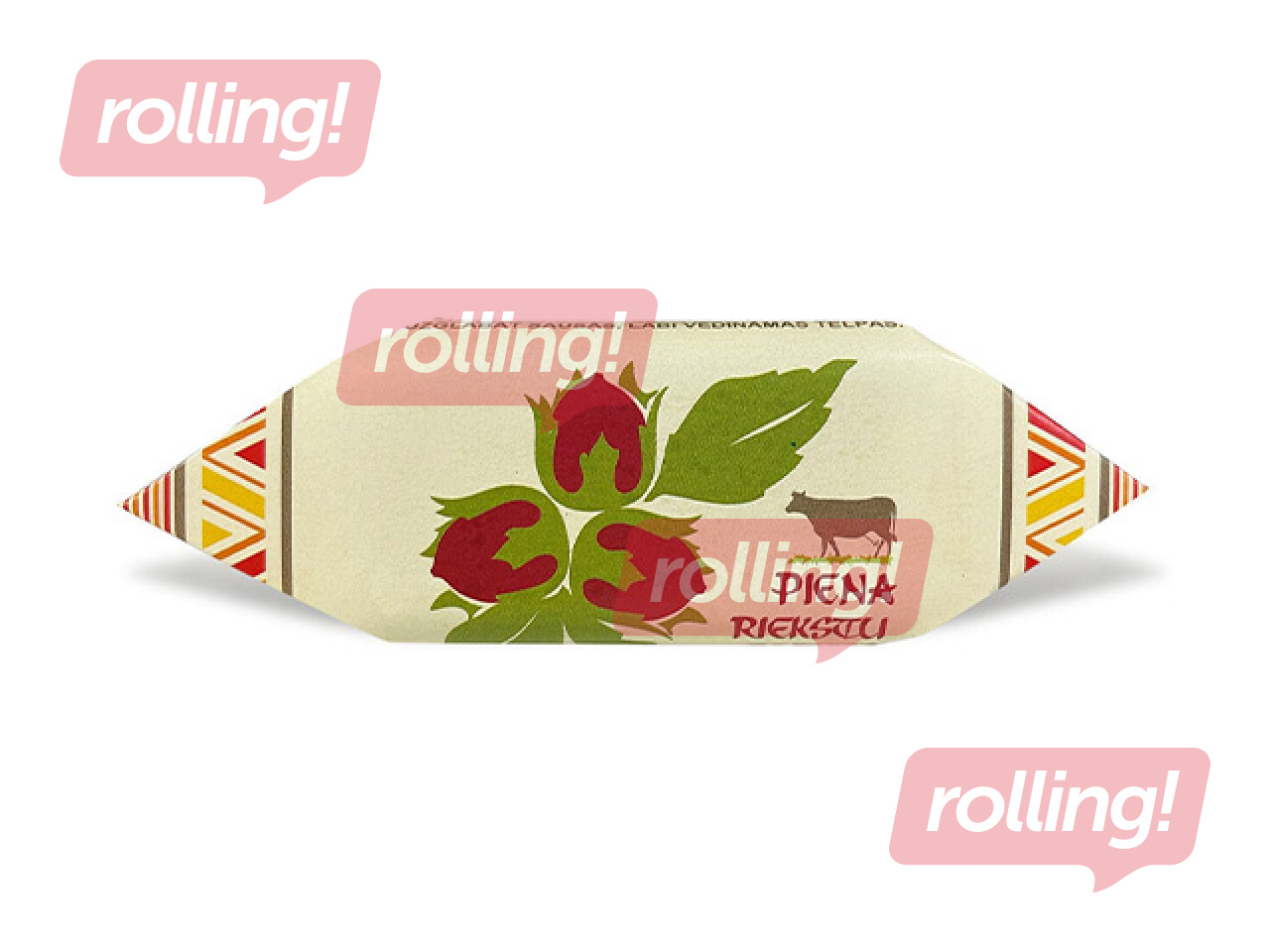 Sastāvs - cukurs, iebiezināts piens (piens, cukurs), glikozes sīrups, saldkrējuma sviests (piens), lazdu rieksti (9%)  Svars - 100g