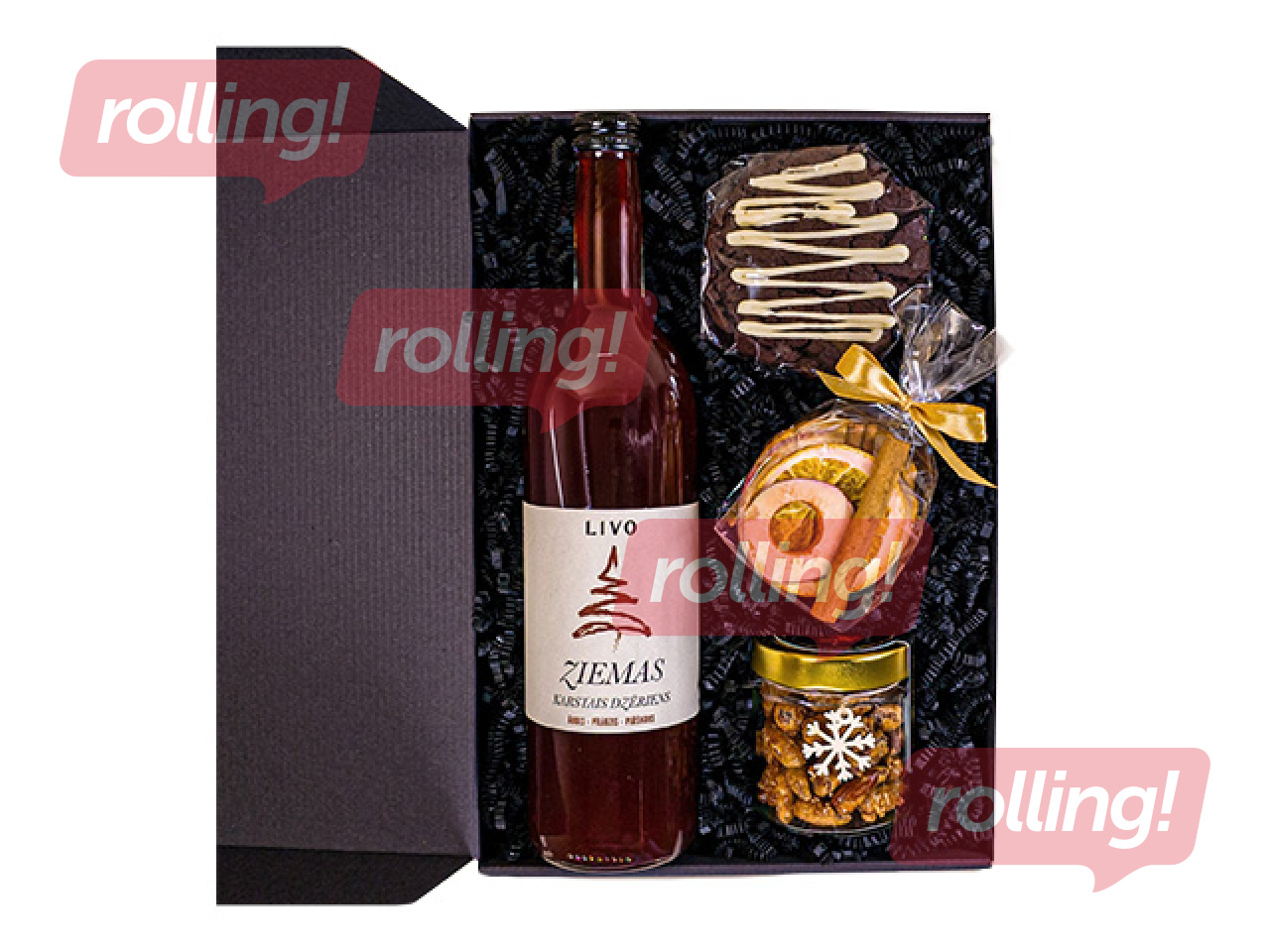 Bagātīga gardumu dāvana mierīgam ziemas vakaram – sildošs karstais dzēriens ar plūškoku, āboliem un pīlādžiem, šokolādes braunija cepums un saldi kārumi, kas piešķir vakaram burvību.