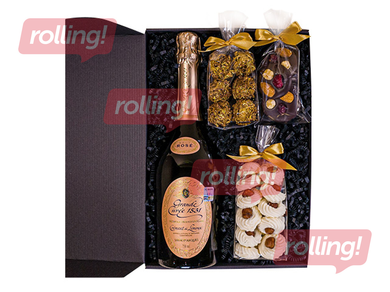 Izsmalcināta dāvana svinīgiem mirkļiem – franču dzirkstošais vīns Grande Cuvée 1531, šampanieša trifeles, tumšās šokolādes kārumi un kraukšķīgi bezē cepumi ar lazdu riekstiem. Grezna kombinācija, kas piešķir svētkiem eleganci un dzirkstošu noskaņu.