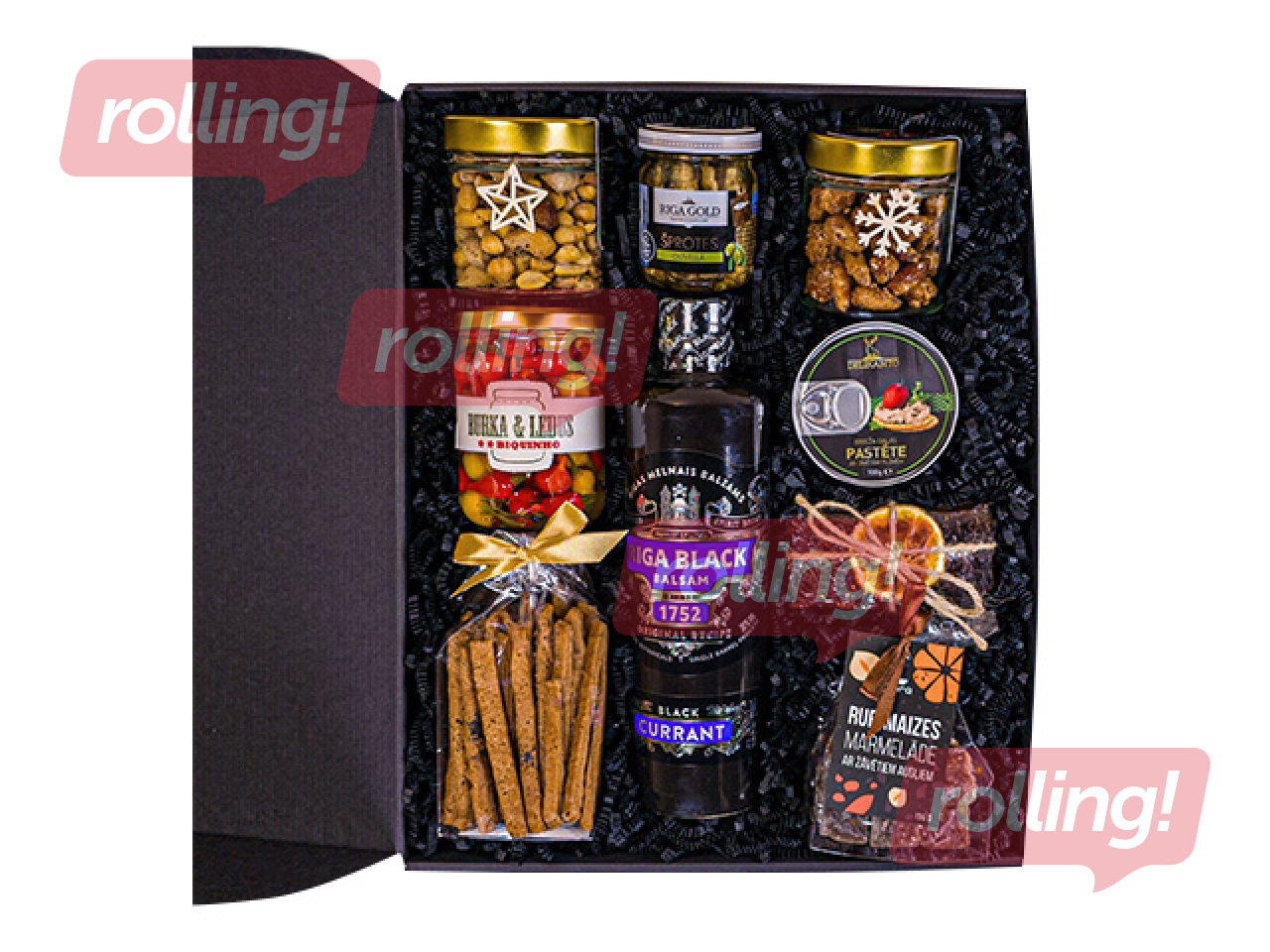 Dāvana ar īstu Latvijas raksturu – izsmalcināta brieža gaļas pastēte, rupjmaizes marmelāde, šprotes un pikanti čili marinādē, ko papildina riekstu gardumi un upeņu Rīgas Melnais balzams. Tā ir bagātīga izvēle, kas apvieno gan tradicionālas vērtības, gan svētku noskaņu.