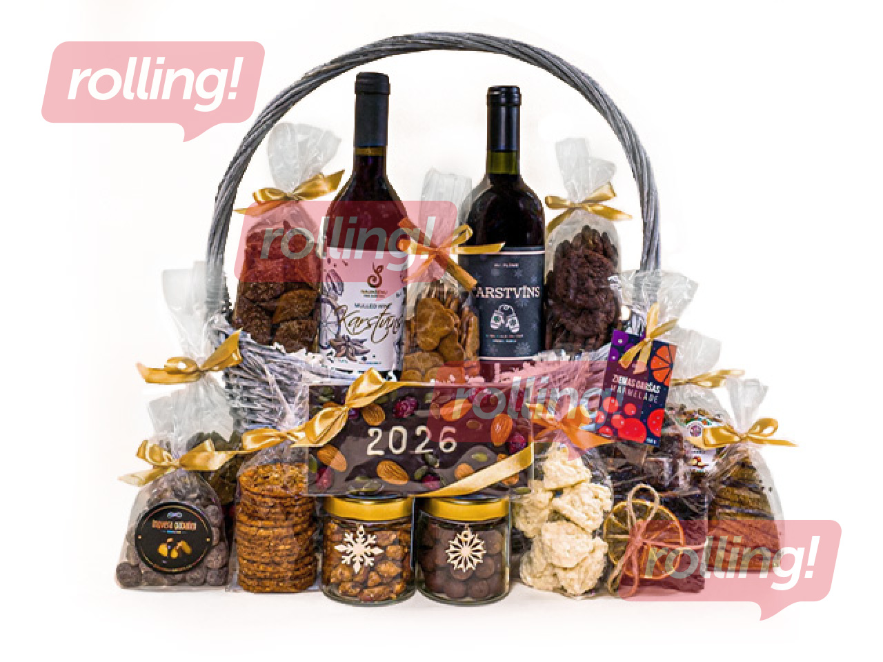 Svinīgs dāvanu grozs ar karstvīnu, svētku kēksu, šokolādi un dažādiem gardumiem – piparkūkām, cepumiem, sukādēm, riekstiem un marmelādi. Dāvana, kas apvieno Ziemassvētku siltumu un Jaunā gada sagaidīšanas prieku.