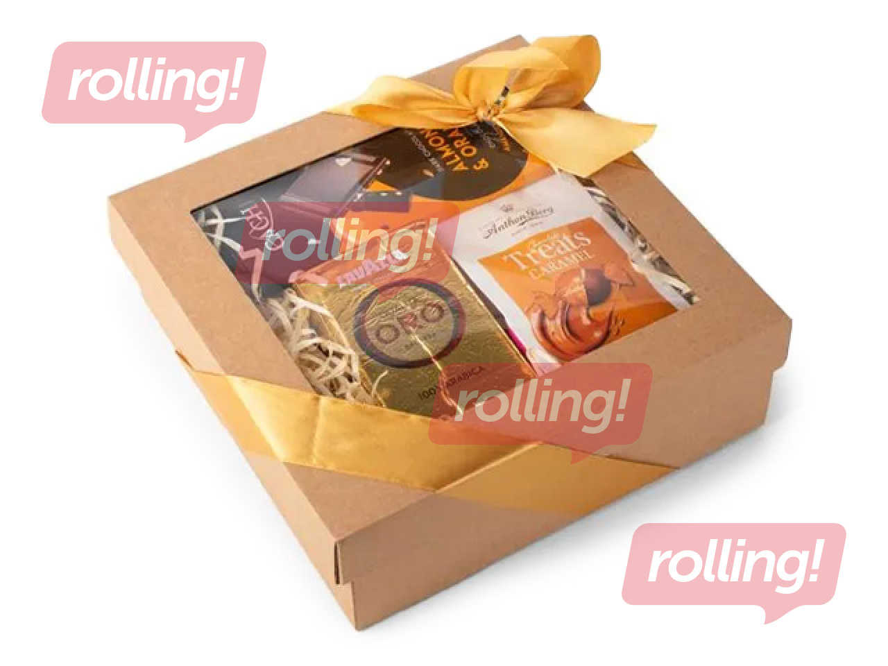 Elegants dāvanu komplekts, kas apvieno saldumus un aromātisku kafiju — lieliska izvēle svētkiem, pateicībai vai īpašiem mirkļiem.